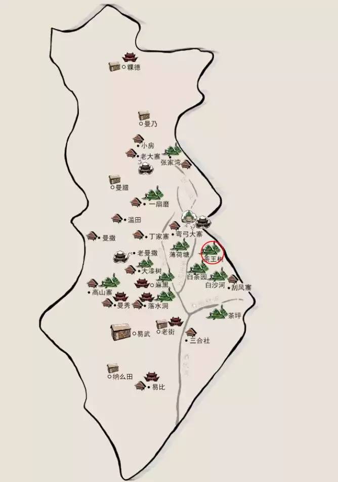 茶王樹是易武各產(chǎn)地中道路最險的,傳說其茶地中有過樹干粗得難以想象的茶樹,因而得名“茶王樹”。由刮風(fēng)寨瑤族重新發(fā)現(xiàn)管理,是目前刮風(fēng)寨采制茶地中價格最貴的?!兜岷S莺庵尽酚涊d,“茶王樹”本武侯遺種,至今夷民祀之,距今有上千年的歷史。