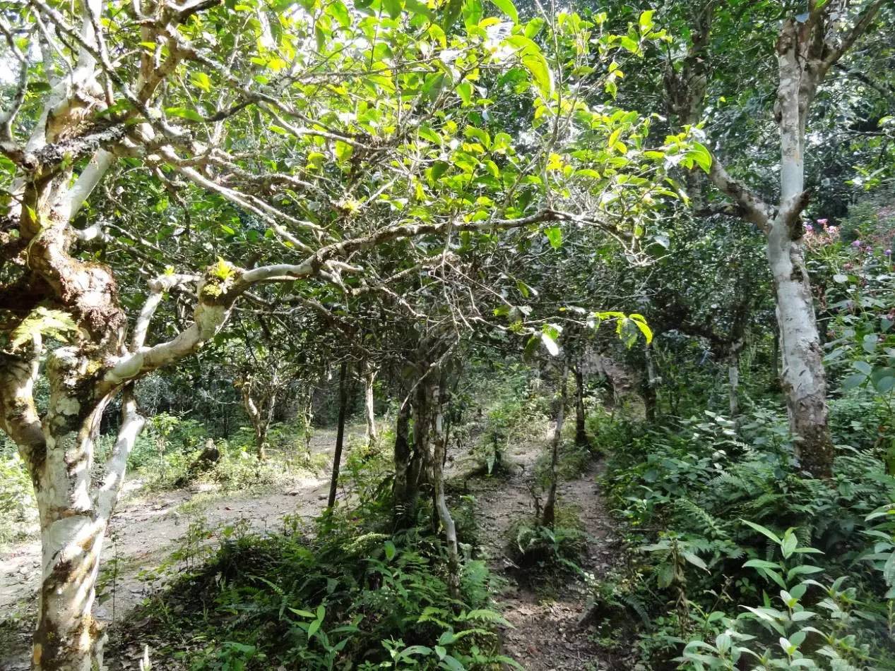 章朗古茶園分布在章朗寨子附近的樹林里,有近千畝之多,但這些古茶園摞荒的時間太久,大部分沒有刈復(fù)出來,茶園里草深齊腰,還長著許多闊葉木。章朗的古茶樹看上去沒有南糯山、老曼峨的古茶樹年代久遠(yuǎn),樹圍在七八十公分的占多數(shù),茶樹大多沒有砍過稍尖,樹高五六公尺,采摘不容易。
