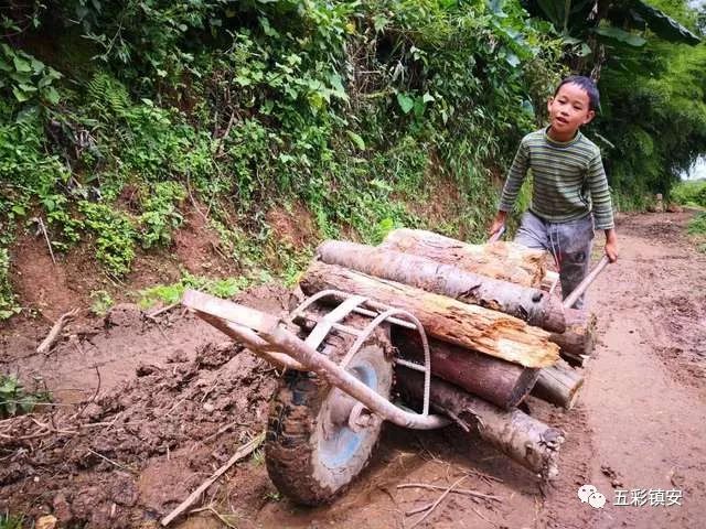 回歡村高寨三組的孩子在山路上用獨(dú)輪車在幫家長(zhǎng)運(yùn)柴
