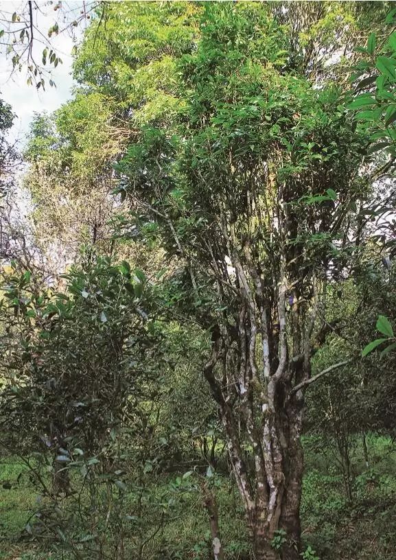 如果沒有人特別指明,以及那棵樹周圍的與這片森林毫無瓜葛的鐵絲網(wǎng),恐怕一般人是很難分清的。在這棵茶樹的周圍,還生長著一些相對這棵茶樹而言小得很多的野生古茶樹,也有可能是這棵茶樹上的茶果掉下來后生長出來的。我看過很多茶山的古茶樹,最有規(guī)模的應(yīng)該算是賀開山了。那些地方的古茶樹雖然也比較粗大,但高度幾乎都差不多,基本在兩米至三米,樹與樹之間的間距也比較平均,人工種植與采摘的痕跡十分明顯,因此專家認(rèn)定那些古茶樹都屬于人工栽培型。