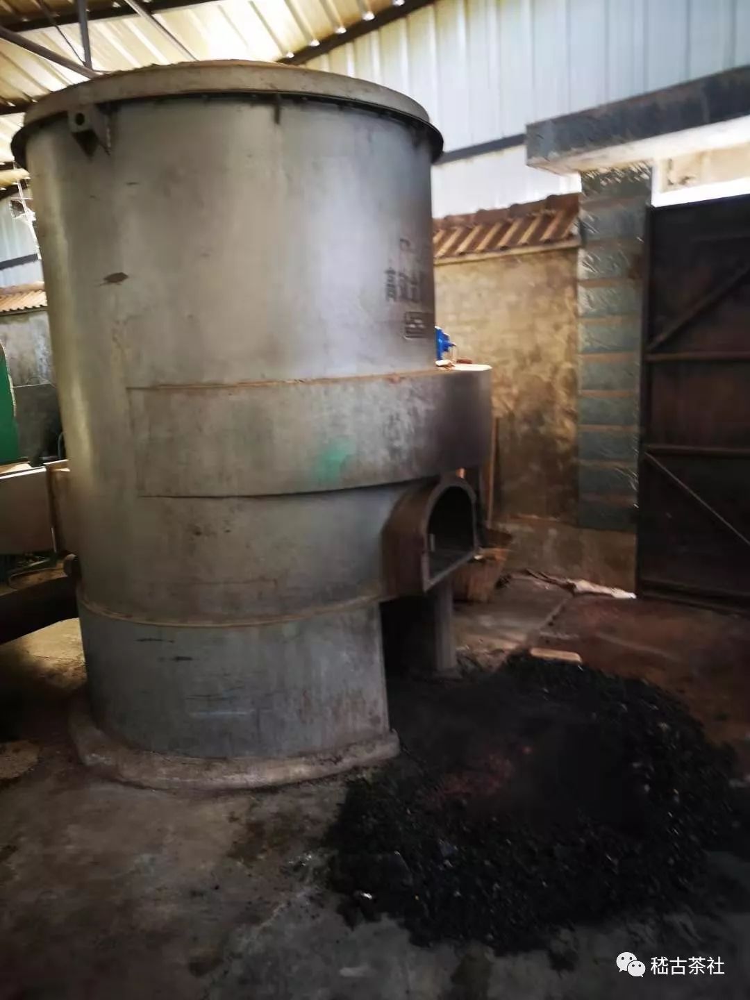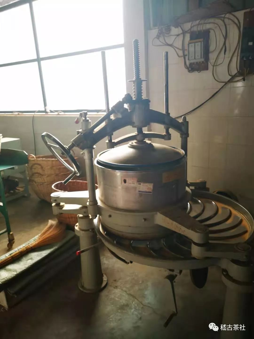 揉捻機(jī)上部是一個(gè)類似鍋爐的裝置,將萎凋好的茶葉放入其中。