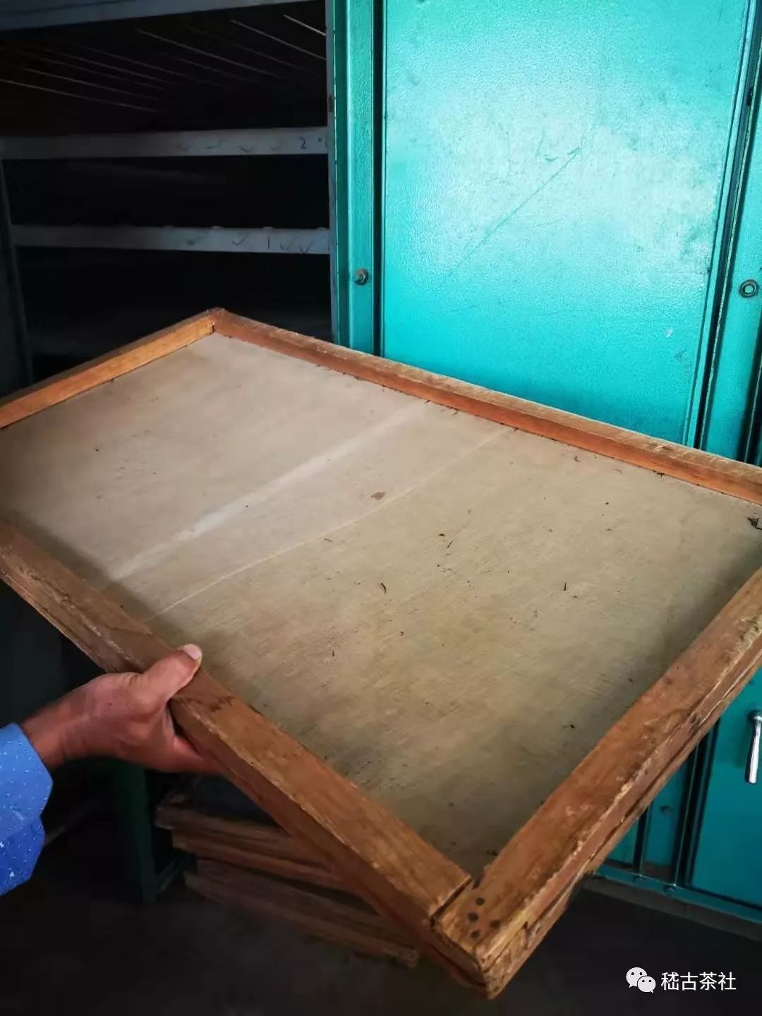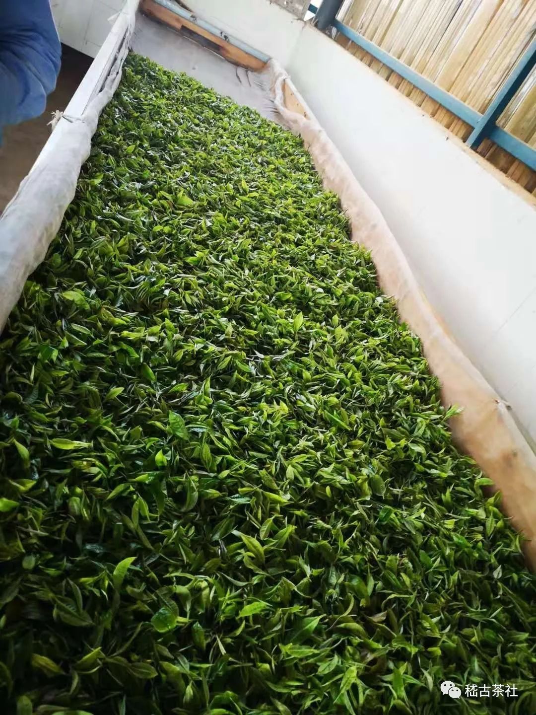 正如圖中所看到的,茶葉被攤放在萎凋機(jī)的棉布上,棉布下方有風(fēng)機(jī)持續(xù)鼓風(fēng),加快茶葉脫水變軟的速度。