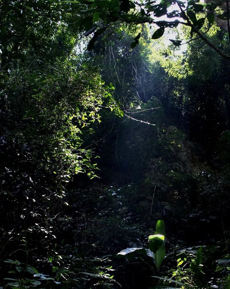 進(jìn)白溪谷時(shí)穿長褲的要把褲管扎緊,其他人要用塑料袋把腿纏起來,防蚊蟲,這里的蚊子咬了人體質(zhì)好的一個(gè)星期才能消腫,一般體質(zhì)不好說。越往腹地走越難行,開啟四驅(qū)模式,手腳并用,覺得回到森林腹地的我又退化了。帶我們一起進(jìn)去的人都覺得太難走了,不想再走第二次,帶上干糧,直接就背著茶簍到了就采回來了,且喝且行且珍惜不是一句空話!