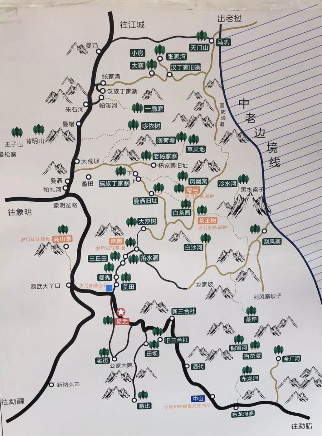 說到易武,我們會習(xí)慣性地想到“七村八寨”這個詞匯,那是因為在傳統(tǒng)的易武茶區(qū),這“七村八寨”是最有代表性的。七村所指:麻黑、落水洞、高山、曼秀、張家灣、三合社、易比;八寨指導(dǎo)是:刮風(fēng)寨、瑤族丁家寨、漢族丁家寨、舊廟、曼灑、大寨、新寨、倮德。
