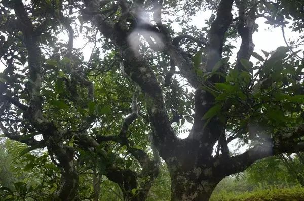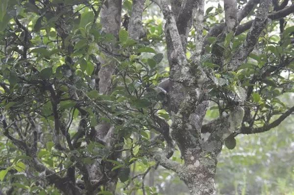 雨還是沒有停,我們只好冒雨上茶山。據(jù)介紹,砍盆箐村坐落在半山腰,共9戶有四十多人。透過朦朧霧氣,我們找尋到了生長在深山的一棵棵古茶樹。它們有的高約四五米,蒼穹的枝干上,斜生出許多彎曲的穹枝,枝條上長滿了一片片翠綠的葉子,在雨水的滋潤下,一個(gè)個(gè)嫩綠的小芽葉已長出。一粒粒明亮的水珠滾落到葉子上,看去好像綴滿了無數(shù)亮晶晶的珍珠。