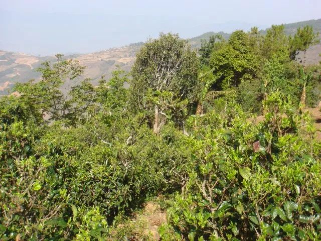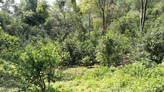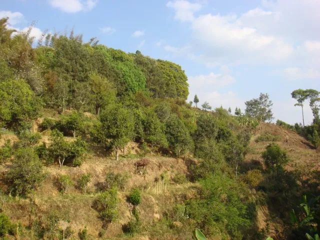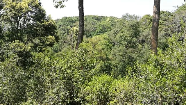 大約走了一個小時的路程,茶農(nóng)大哥說:"就是這里了"。跟前的這片和對面的全部都是茶樹。抬眼望去左右的山坡上都長著很多茶樹,大多是直立向上,未經(jīng)人為矮化,交錯長在森林里。植物多樣性給這里的茶葉帶來一股特殊的香味。