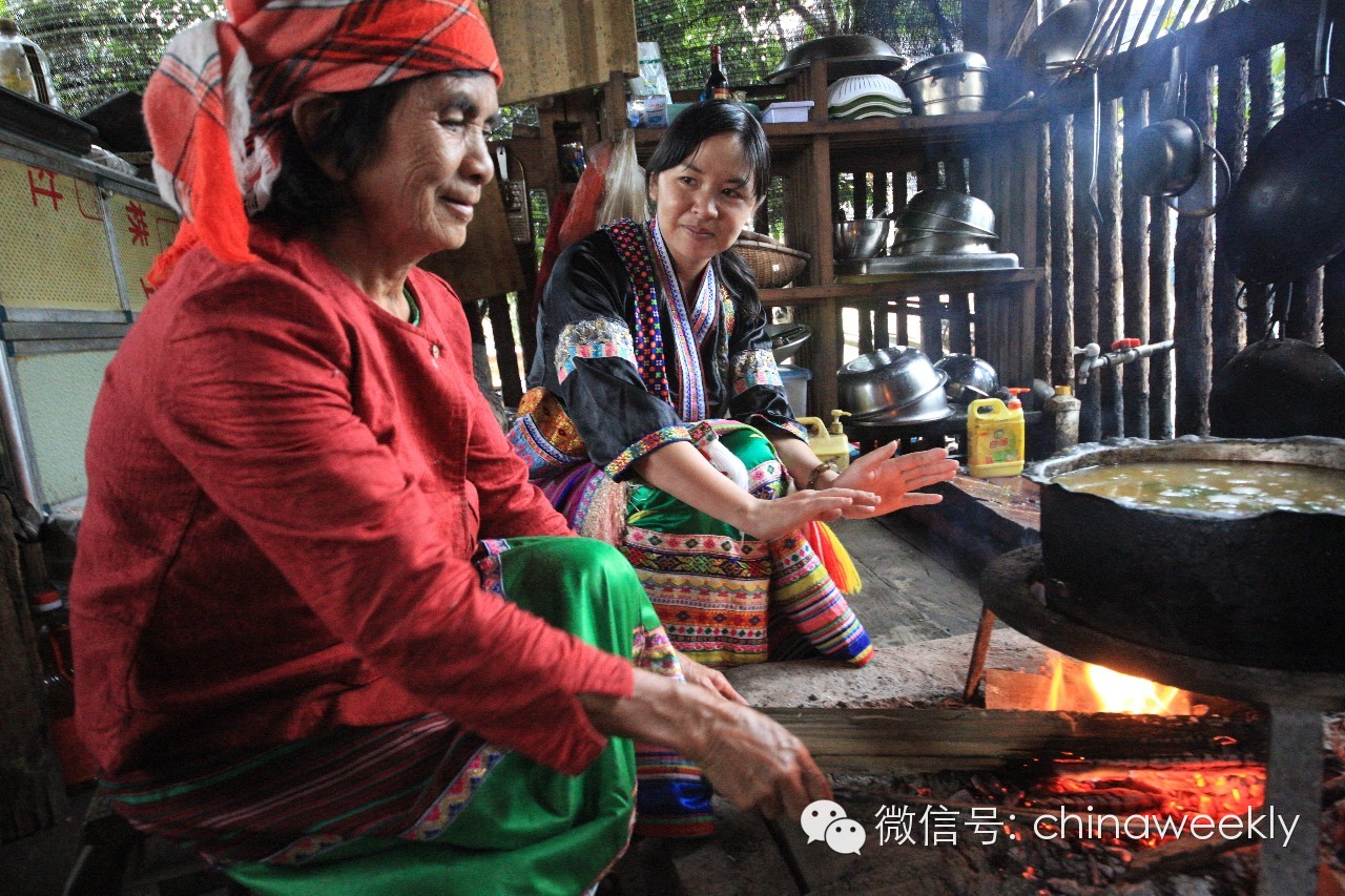 木樓小巧而別致,中間是客廳,擺有一張巨大茶幾??孔笫桥P房,靠右的則是廚房,廚房正中央正燒著一堆篝火。長裙女就坐在火塘邊, 她旁邊坐著一位和她同樣裝束的老太太。