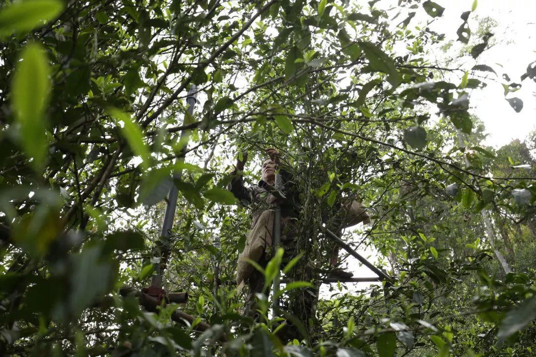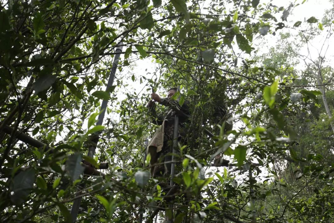 我們一路徒步上爬,古林密密叢叢,陣陣林間微風(fēng)拂面。茶樹從古至今一直處在荒養(yǎng)的狀態(tài),也成就了迷人的山野氣韻,由于這些茶樹都很高,所以采摘也是很艱難的,當(dāng)然近些年為了保護(hù)茶農(nóng),避免在采摘茶葉的時候受傷,也會搭一些簡易的架子,而摘完茶,一人幾公斤的鮮葉又一步一步順?biāo)卤吵霾璧亍?/p>