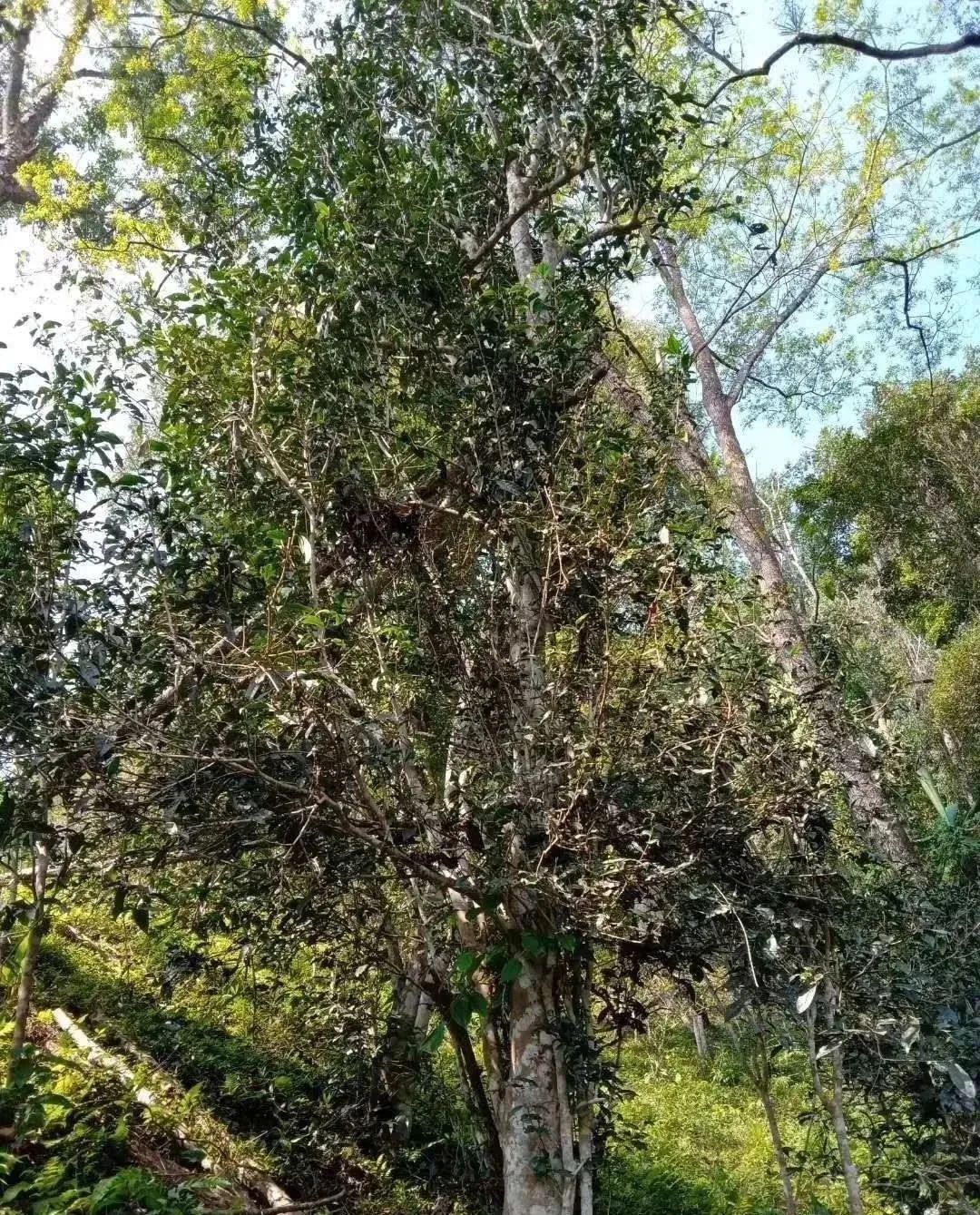 茶樹從半山到山頂散落在陡峭的山坡上,而根則深深的扎進土壤里,幾百年如一日的吸收著腐葉和易武地底特有的礦物質(zhì)所提供的養(yǎng)料。因為茶樹的周圍都是茂密的原始森林,為了更好的接收光照,所以易武白茶園的茶樹多以高見長。