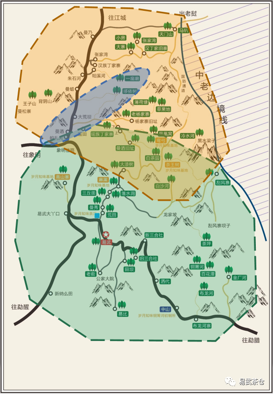 黃色的部分是以前的曼撒茶區(qū)(古代),綠色的部分是易武茶區(qū)(古代),藍色的部分是現(xiàn)在的曼撒村,整張圖就是現(xiàn)在的易武產(chǎn)區(qū)。