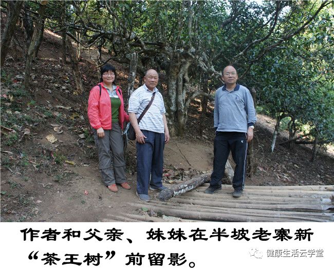 向陽村的“南糯茶王樹”死去后,2001年云南省茶科所和勐海縣茶葉辦的專家在南糯山半坡老寨的古茶園里,又發(fā)現(xiàn)了一棵也有800多年樹齡的栽培型茶樹,并命名為新的南糯山茶王樹,用鐵絲網(wǎng)圍護起來。茶王樹雖然在半坡老寨,但是所有權(quán)卻屬于竹林寨村民的。我們一家人滿懷著激動和崇拜的心情,瞻仰了這株老茶樹。