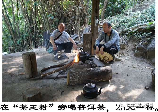 茶王樹的主人在旁邊蓋了一個茅棚,目的是用來守護新的“南糯山茶王樹”,也煮茶給我們這些茶王樹朝圣者喝,25元一杯,相當(dāng)于機場星巴克咖啡的價錢,當(dāng)口渴難忍的時候就不算貴了。