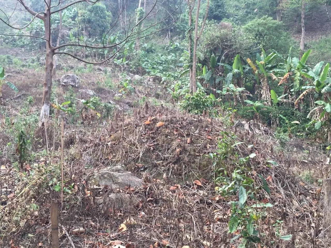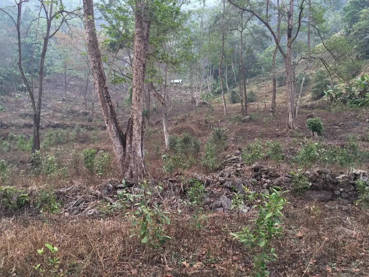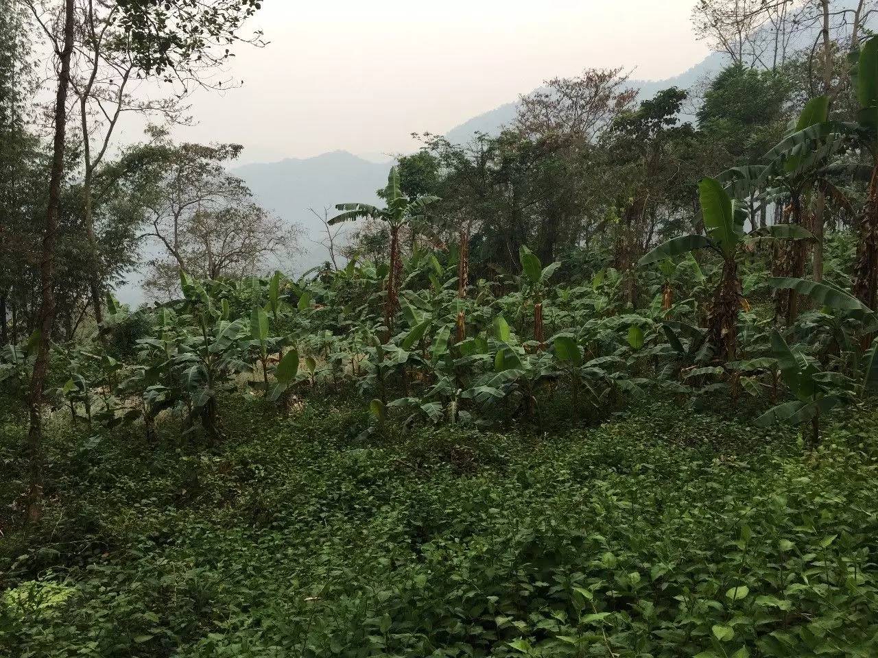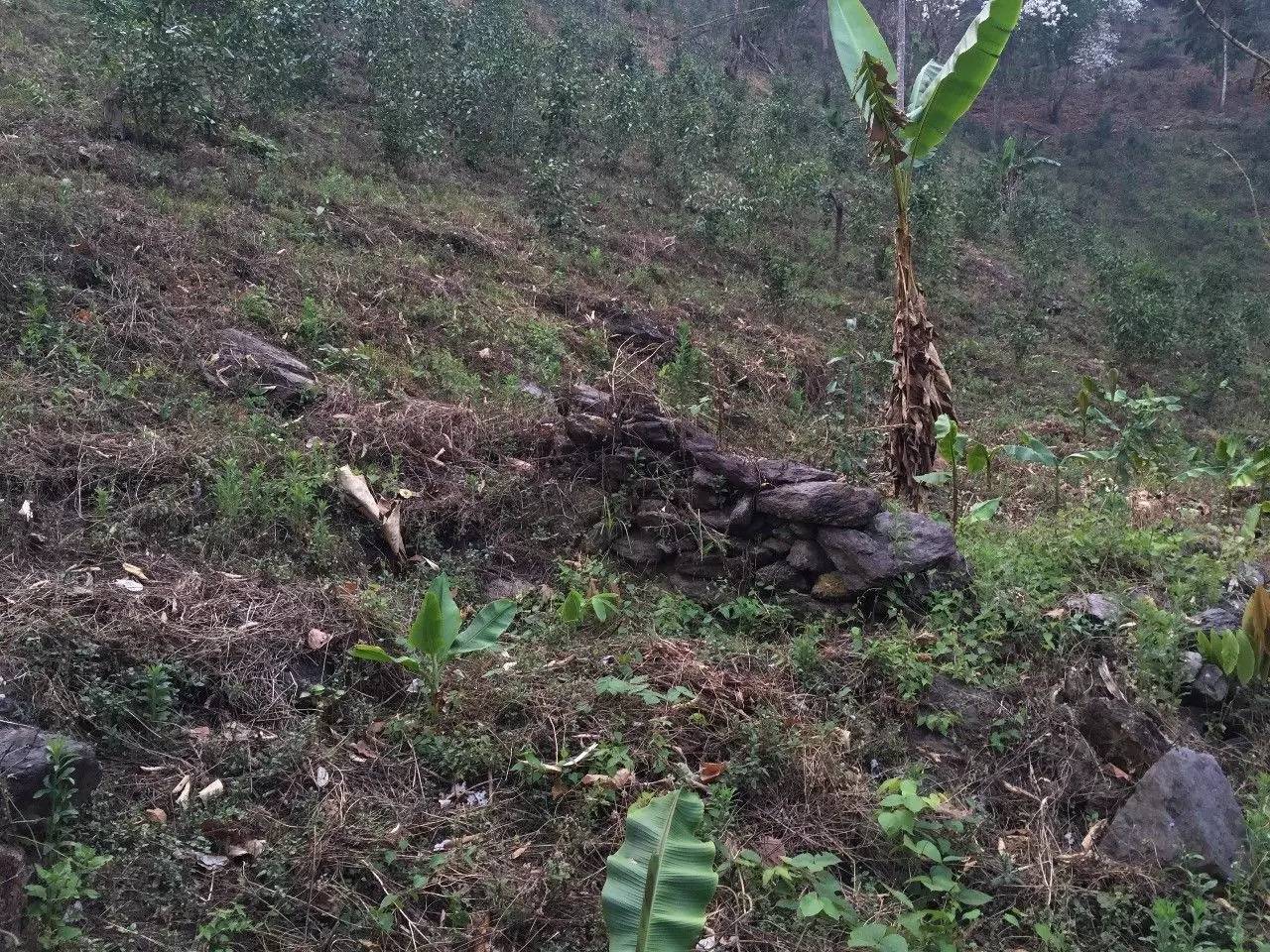 看著小帥和樂也還睡的沒醒,不忍心叫醒他們,自己想著昨天沒找到茶王樹村遺址,乘現(xiàn)在抓緊去找找。按照昨天老人指的方向,走了不久發(fā)現(xiàn)一個岔路,防止等下回頭不認識路,在路上做了記號,安心沿岔路繼續(xù)走,不到分鐘有條通向山底冷水河的路,下方遠處一大片的芭蕉林,覺得應(yīng)該對了。繼續(xù)前行,慢慢的路就沒有了,只能順比較平整的山坡繼續(xù)下行。很快到了芭蕉林跟前,邊上是一大片的空地,還有殘留的石墻,這回算走對了。