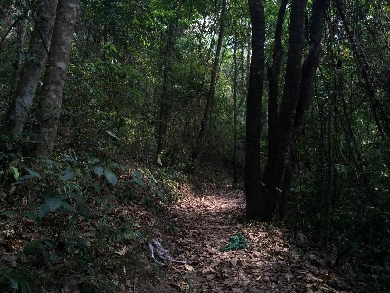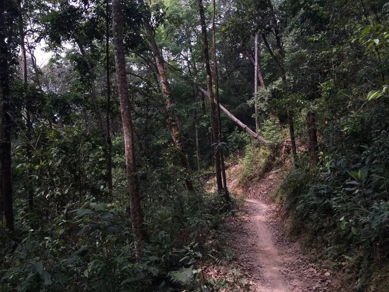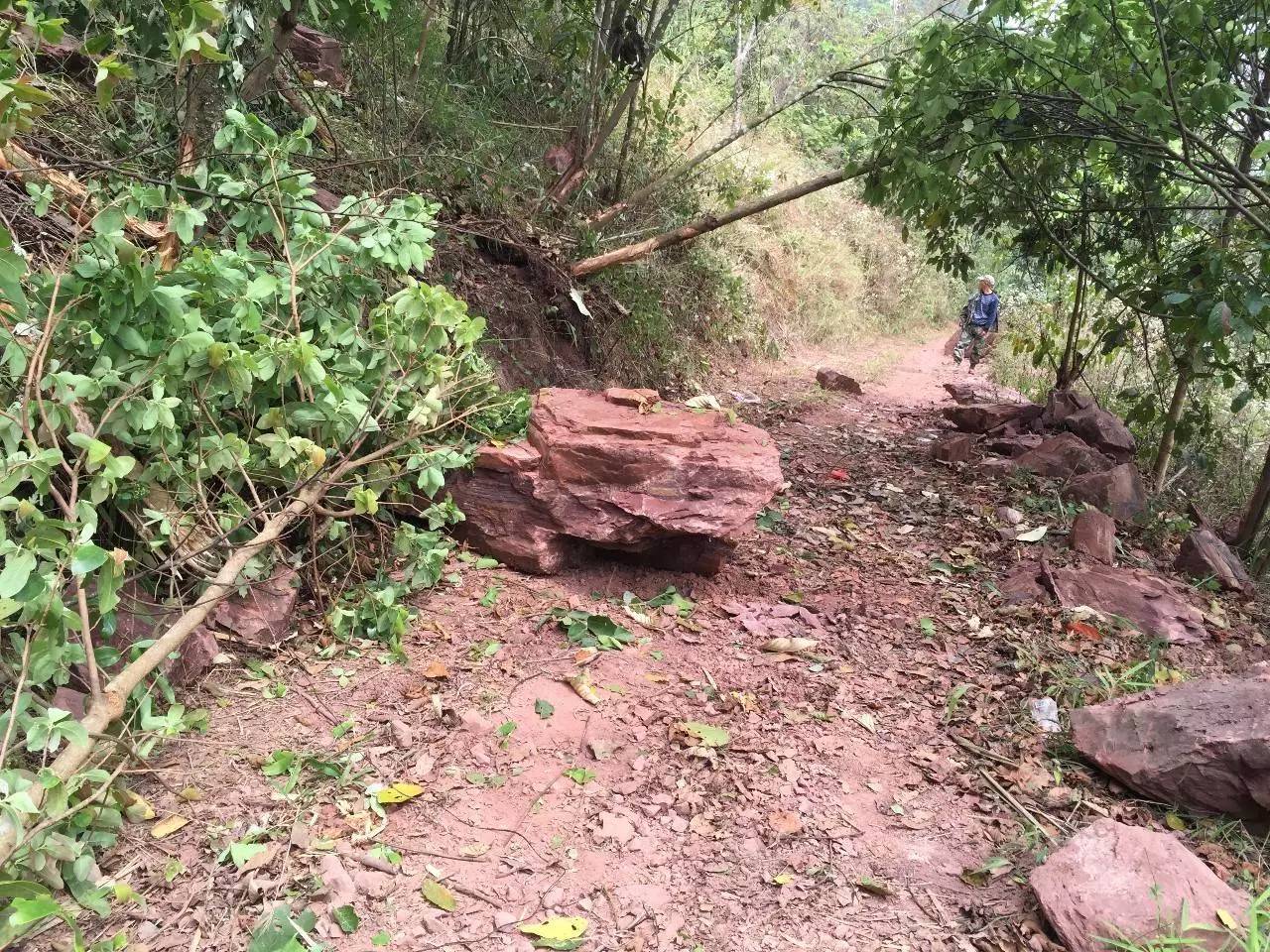 這時候也才五點左右,西雙版納這邊天黑的晚,所以收拾一下,帶上兩根樹枝撐著按照前面茶農(nóng)指的路就直接沿著山坡下山了。出發(fā)前與小帥約定好,如果我們真迷路了,就打開強光電筒向空中照射,他就帶人來找我們。爬了十幾分鐘山坡看到下面一條崎嶇的山路,到了路上總算安心一些,沿著小路一直向南邊走去,路上碰到采茶下山的茶農(nóng),再問茶王樹村遺址在哪里?估計普通話不太標準,反復(fù)幾次才大概明白,說是再往西南走看到大石頭就到了。