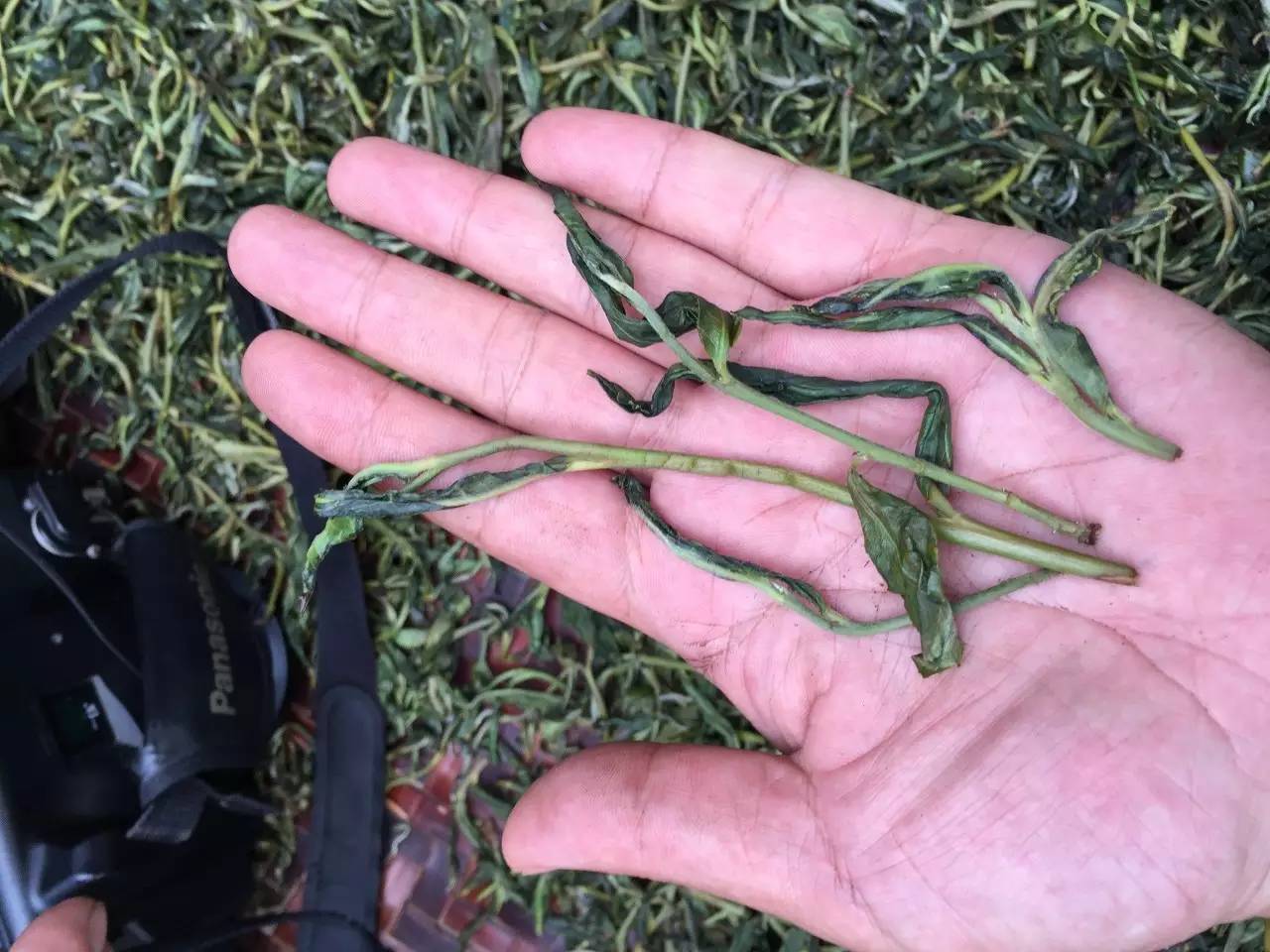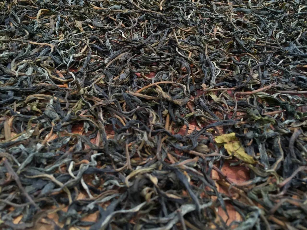 茶農(nóng):現(xiàn)在溫度高不能揉捻,因為揉捻的時候就會破皮,這樣的茶泡出來會混湯。(給我們拿了幾根茶葉看),現(xiàn)在外面很多人說這樣的才是古樹茶,小芽小葉的是小樹茶。你們看一下,這里面有茶梗很粗壯的茶,梗也很長,這種就是我們剛才看到主枝上的陽光比較充足的茶,也有梗比較細的,但是比較長的茶,這種是陽光不太充足這邊的主枝茶,另外這些小芽小葉梗也短的茶就是旁枝上的。再有就是雨水茶,雨水比較充足所以條索也會容易粗壯。