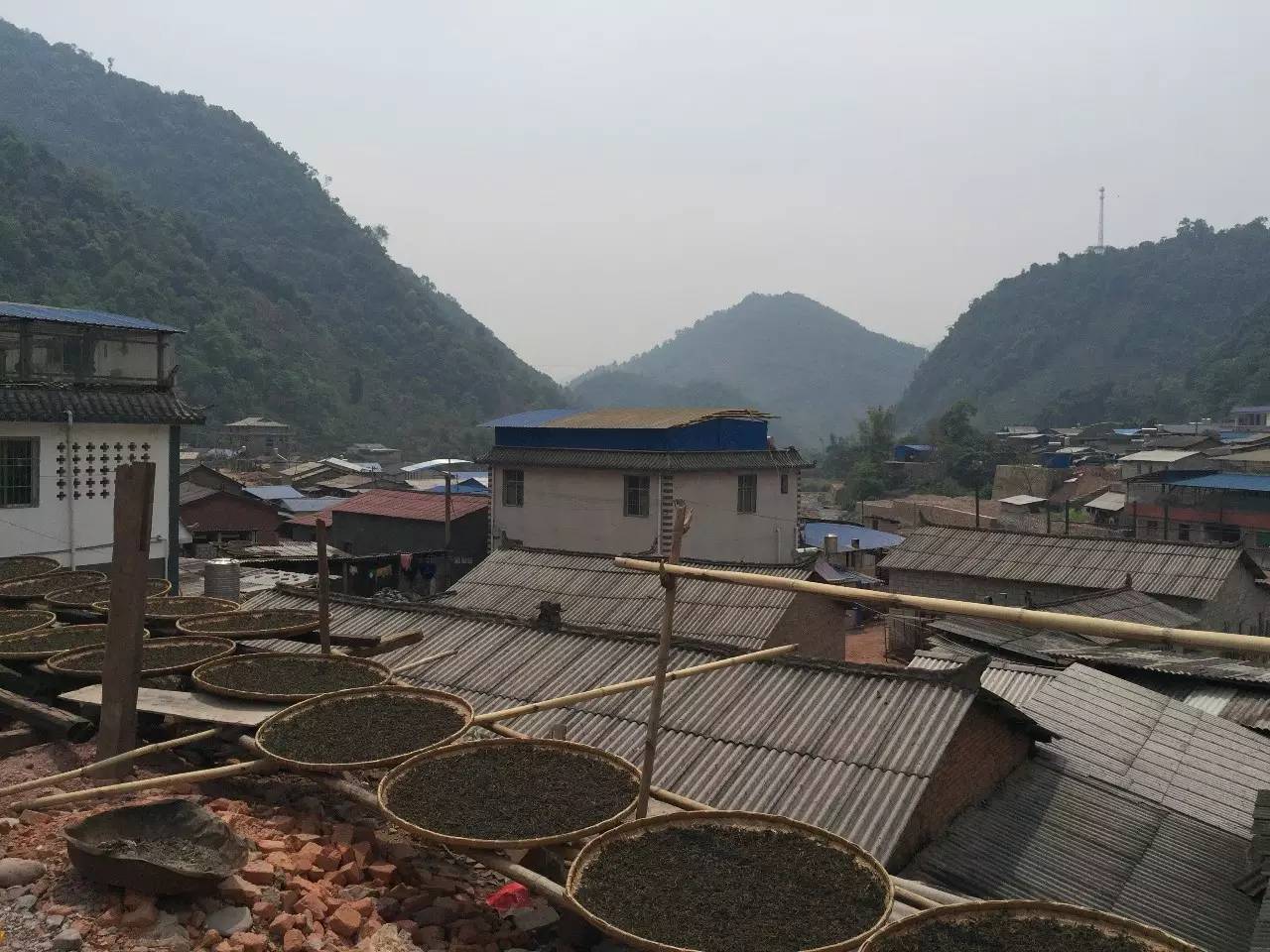 3月30日大清早,刮風(fēng)寨的茶農(nóng)來易武接我們。兩個小時左右的山路顛簸,終于到了地方。已經(jīng)午飯時間,就在茶農(nóng)家吃了。進山只能開摩托,只好拜托茶民去借。我們乘機在寨子里到處走了走,看見很多家門口都曬著梅菜干,不免好奇,瑤族人喜歡吃這個__我們浙江的???走近一看,原來是茶葉,抓把一聞,真一股梅菜干味(渥紅情況),想來刮風(fēng)寨不是每家都會做茶。