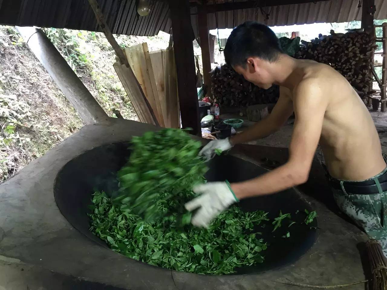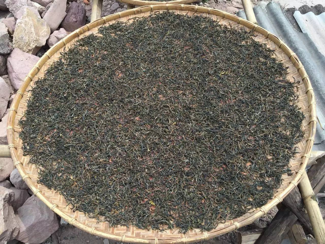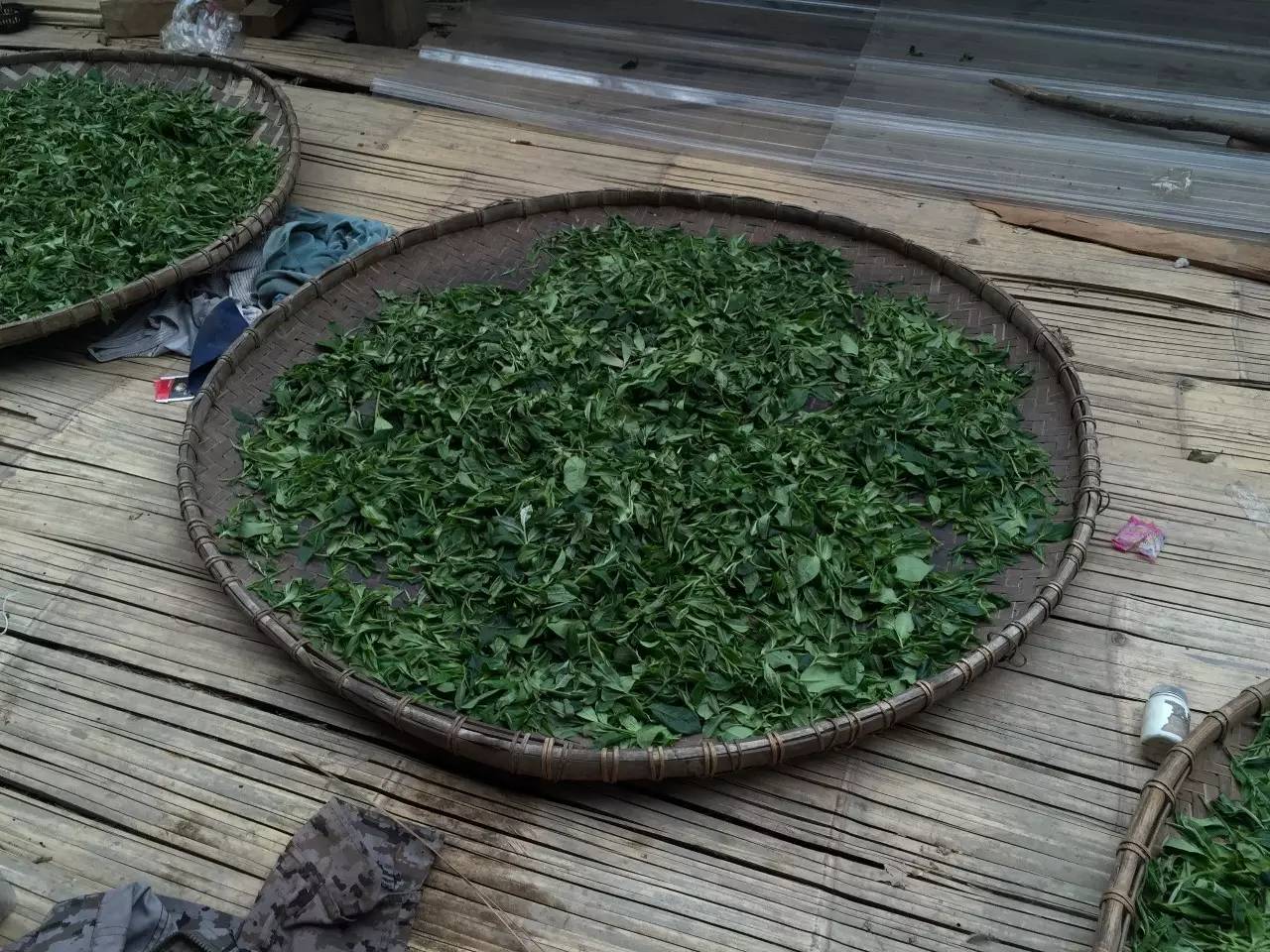 跟著茶農(nóng)回到初制所,看到工人已經(jīng)積攢了不少鮮葉了,一部分攤涼也已經(jīng)到位,茶農(nóng)開始殺青,十幾分鐘后殺青完畢,繼續(xù)攤涼。