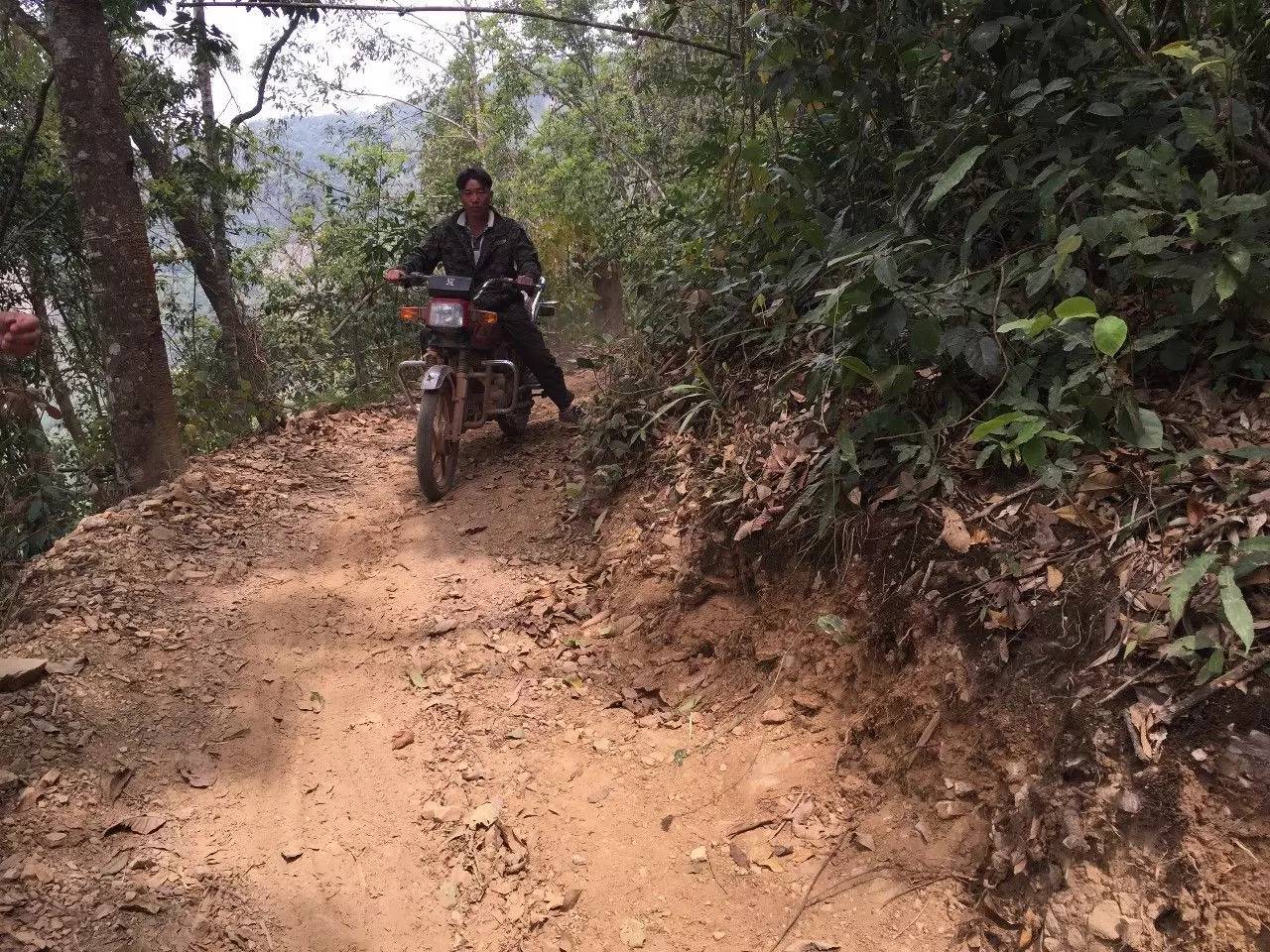 借到三輛摩托車,熱情的兩位茶民開摩托帶我們進去,樂也自己開一輛。一路上,經(jīng)過了國有林的大峽谷,那邊海拔1800多米。走了快一小時的時候,我非常好奇地問載我的茶農(nóng),這條路這么好,還能開摩托車,而且一路上開山辟林,以你們寨子的實力是絕對做不出來的,政府也不可能幫你們開路,因為里面是原始森林。茶農(nóng)說刮風(fēng)寨使的一個秘技,幾年以前,對外宣稱山里面有豐富的礦產(chǎn),當(dāng)初是沒有路的,被吸引來的外地老板只能靠寨民帶路進山,寨民就把他們一路引向了茶王樹,而冷水河的寨民又引他們開出了一條去那兒的路---沒路怎么開礦?老板說,要有路!于是有了我們今天這兩條路。等路快開完了(投資了近兩千萬),寨民們就到處去上訪,說有人在山里開礦(因為真要開礦,山里的茶樹就保不住了,還有水源也被污染),很快上面查封,礦不能開,路也不能開了(那個誰,就是說寨民很純樸的過來一下,我肯定不打死你)。君臨能駕臨,參禮茶王,先該感謝這些開礦(路)老板,與人方便。