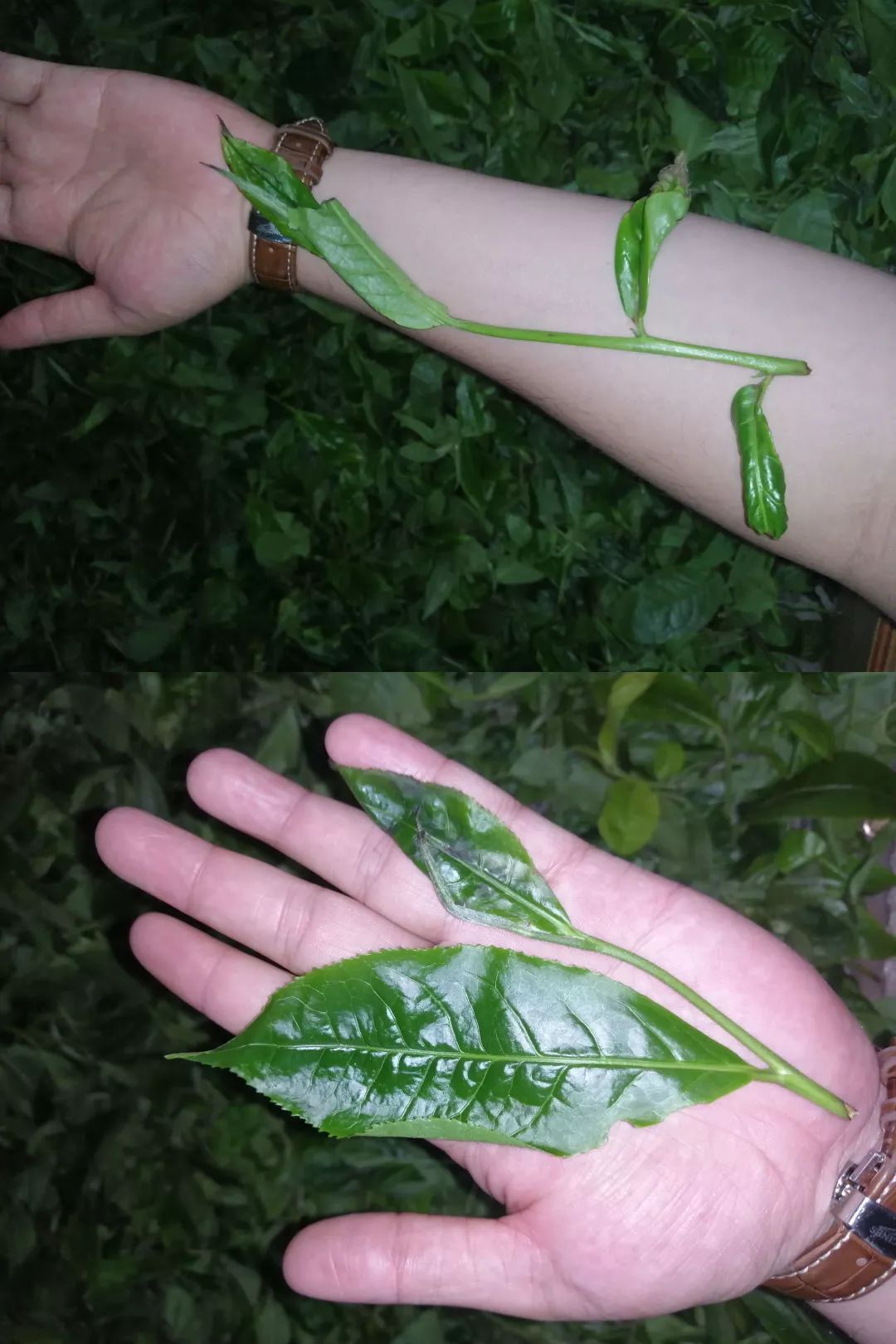 右側圖片為桐箐河古樹茶葉,生態(tài)環(huán)境好,那茶葉、那茶梗,只能用手掌和手臂來形容了。