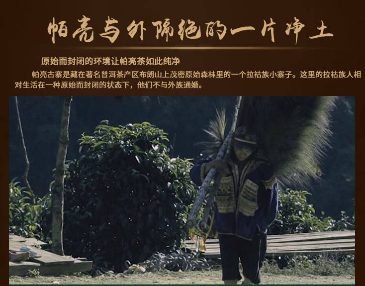 關(guān)于帕亮:被稱做是“與外界隔絕的一片凈土”它是位于西雙版納勐海縣的寨子,這里住著33戶拉祜族村民,他們有自己信仰的神靈,并家家戶戶每日敬奉禱告。境內(nèi)都是山巒起伏,溝壑縱橫,密布原始森林,村寨都是散落在山坡林間。村民們世世代代都在古茶樹上爬上爬下的,但是他們從不人為地干擾古茶樹,任憑茶樹自由生長,從不施肥打農(nóng)藥等。這不是說他們不愛護(hù)古茶樹,相反,他們對古茶樹敬若神明,把年代久遠(yuǎn)的古茶樹奉為茶王樹,頂禮膜拜,所以這里的茶都是零污染。