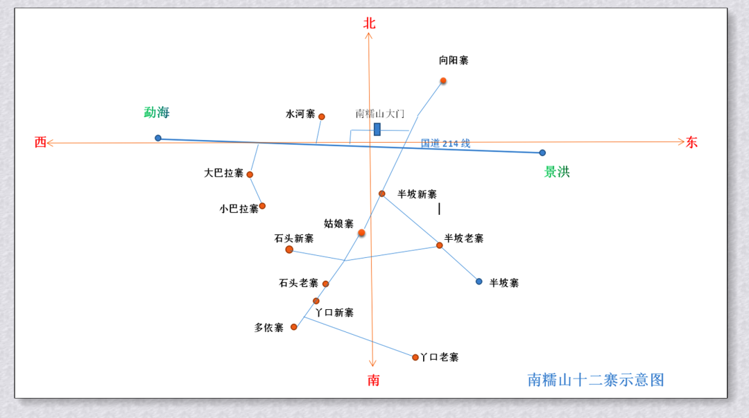 南糯山十二寨當(dāng)中,如果以景洪到勐海之間由東向西的214國(guó)道為分界線,除水河寨與向陽(yáng)寨在此分界線的北邊,其余十個(gè)寨子均位于分界線的南邊,其中大、小巴拉寨沿分界線距南糯山大門(mén)往勐海方向不到2公里,其余八個(gè)寨子則較為集中。