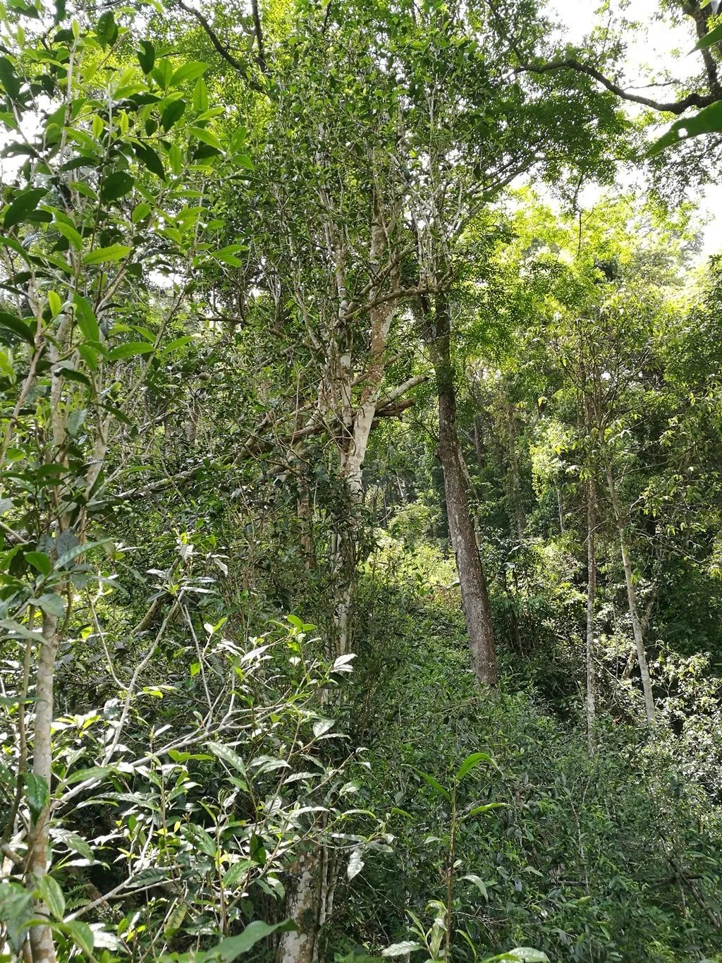 白茶園茶地生長(zhǎng)在彎弓河邊,森林之中,其茶地不是整片生長(zhǎng),是東一塊、西一片分成諸多小塊,散落在原始秘林中,茶地土質(zhì)層薄,巖石風(fēng)化裸露,河水清澈甘甜,因而口感更加柔甜,該土質(zhì)土壤之屬性,正應(yīng)了陸羽在其茶經(jīng)中所言“茶者、南方之嘉木也,其地、上者生爛石、中者生礫壤、下者生黃土”。這也讓我想起了鄧義民拿給我的一款新資源,其茶樹(shù)均生長(zhǎng)在荒山巖石之上,該茶野性十足,氣感之強(qiáng),實(shí)為好喝。白茶園的古茶樹(shù)大部分在早年被矮化過(guò),所以高桿較少。