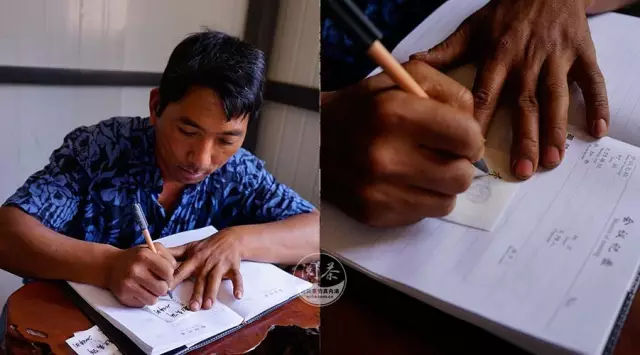 古樹(shù)單株將會(huì)壓成餅保存,李開(kāi)華老村長(zhǎng)為我們?cè)趦?nèi)飛上簽上自己的名字以作留念。老村長(zhǎng)說(shuō):“我們做茶的人只要老老實(shí)實(shí)做好自己的本分就行,保護(hù)好生態(tài)環(huán)境,管理好茶樹(shù),做好每一鍋茶;我們歡迎每一個(gè)朋友來(lái)村里看茶,感謝他們讓更多人知道老班章茶葉。”(原話大意)