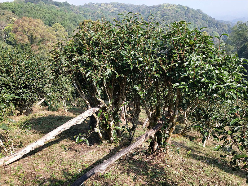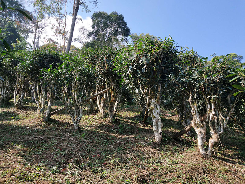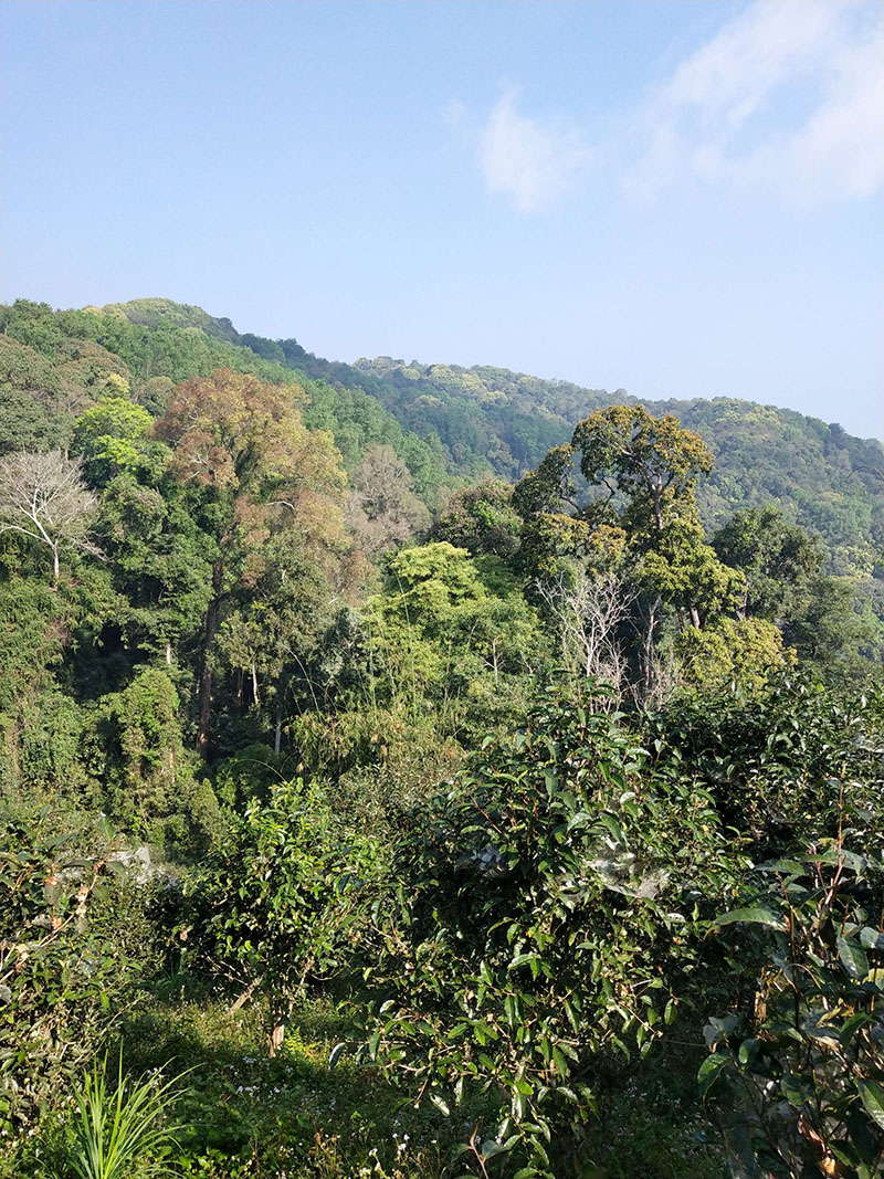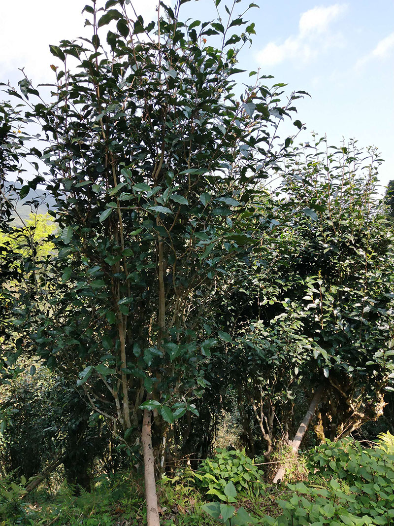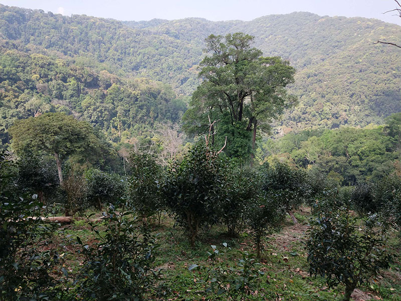 古茶園分布在老寨舊址所在地的山頂。周圍緊挨著古老滄桑的原始森林,尤如一道綠色的畫卷和亮麗的風(fēng)景長廊。這里樹木粗壯高大十分繁茂,可稱得上是天然的大氧吧。