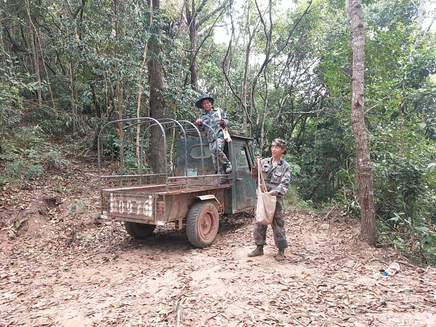 拖拉機(jī),摩托車只能停放在這,去古茶園只能沿著原始森林里彎彎曲曲的小路進(jìn)發(fā)。