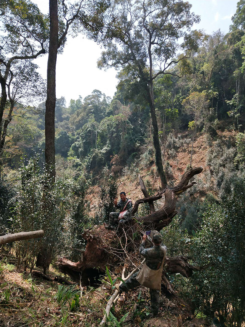 司土老寨(茨通老寨)古茶園成片散布于原始森林的山梁兩旁。我們大約探尋了七八塊茶園,茶園與茶園之間均有森林相隔,一片片隱藏在原始森林里。每到一片古茶園都會讓你感到驚喜!