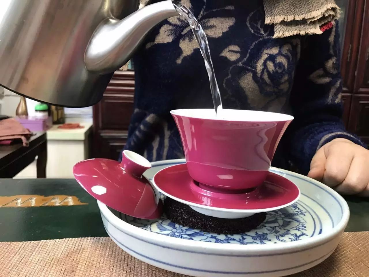 100度的沸水注入蓋碗,稍浸泡后倒去以喚醒茶葉,使之舒展,易于茶汁均勻滲出。