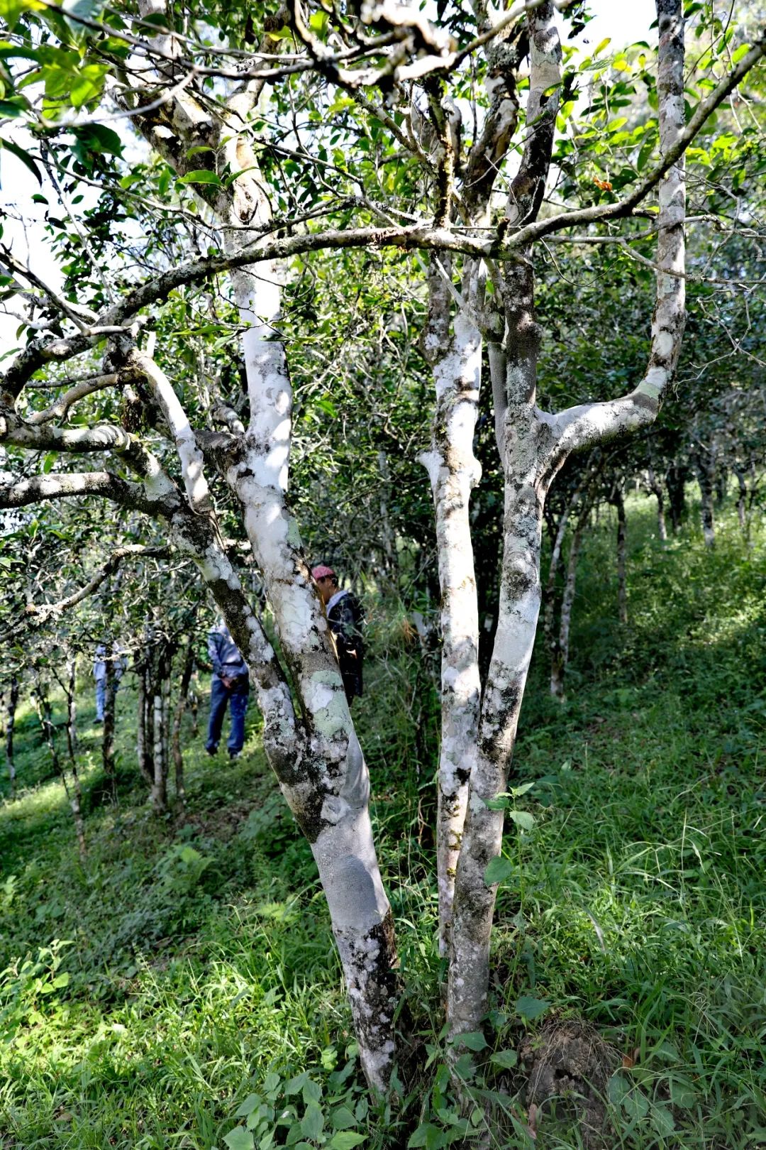 郭龍海和胡文俊帶著我們爬到路上方的古茶園,第一次來失之交臂,第二次有充足的時間,絕不會再錯過??垂挪鑸@,要看最古老或者最挺拔的那棵茶樹,才盡興,才覺得不虛此行,就像很多人到老班章必定要看那棵茶王樹一樣。而要看直蚌的那棵古茶樹,顯然沒有看老班章那棵茶王樹容易,直蚌的這棵,要爬到最里面,它長在陡坡上,一不小心,人就會沖到最下面——沒有誰能攔得住你。這棵茶樹,被胡文俊做成了單株,它對得起單株的定義,夠高,也夠大,關(guān)鍵是生命力旺盛,沒有一丁點衰敗之勢。