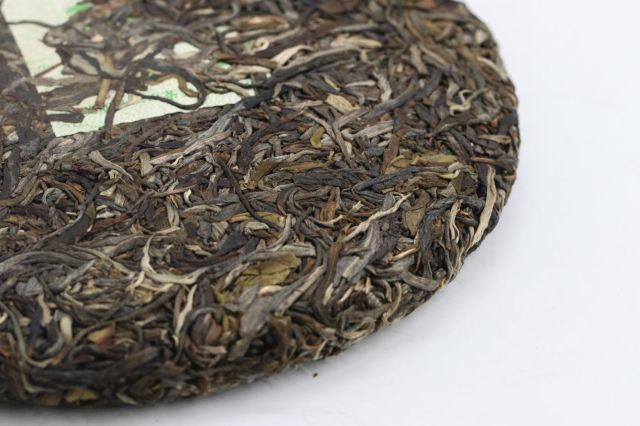 拆看干茶,餅形圓潤,色褐帶青,金毫、銀毫較多,條索清晰分明,較為粗壯,整體勻整。