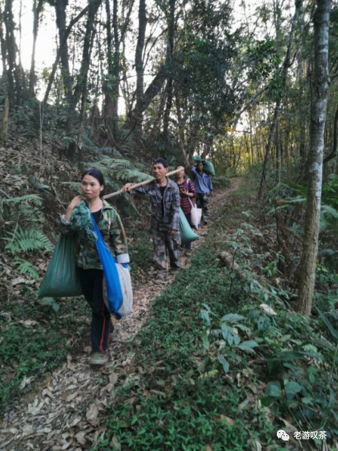 在春花家,老游喝了一泡今年的新茶,感覺(jué)挺好。雖然時(shí)間比較晚了,老游還是迫不及待地想上茶山看看。下午6點(diǎn)20分,老游駕車從小曼竜出發(fā),在行駛了15多分鐘的柏油路之后,開(kāi)始進(jìn)入泥濘陡峭的山路。這段山路還是挺危險(xiǎn)的,路滑旁邊是懸崖,沒(méi)有嫻熟的車技,沒(méi)有四驅(qū)的越野車,根本無(wú)法通行。又行駛了20多分鐘,我們來(lái)到了一塊平整地塊,車停穩(wěn)后,開(kāi)始徒步上山。春花說(shuō),從這個(gè)地方開(kāi)始,只能步行,一直到她家茶園,整個(gè)過(guò)程需要一個(gè)小時(shí)。