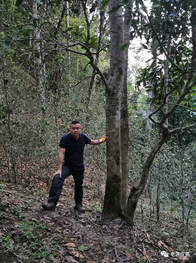 經(jīng)過(guò)幾分鐘的步行,老游終于到了位于山谷地帶的茶地,這里大大小小的茶樹(shù)比較集中,大概有好幾百棵,普遍比較高,有點(diǎn)高桿的味道。這里的植被和生態(tài)保護(hù)的比較好,沒(méi)遭到任何的破壞。老游看了一下,這里茶樹(shù)大小參差不齊,最大的茶王樹(shù)直徑有30多厘米,20多米高;而小的茶樹(shù)直徑也就兩三厘米。趁著天還完全黑,老游在茶王樹(shù)下合影留念。站在茶王樹(shù)下,老游真的顯得很渺小。