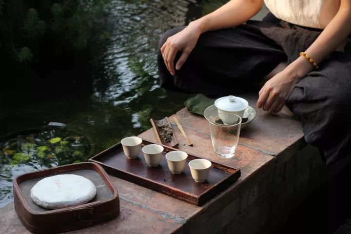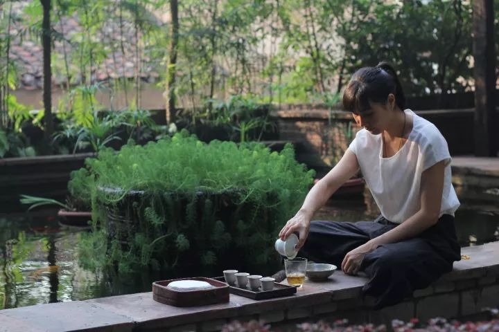 跟隨嘉綺老師來到花園,我們沐浴在秋日午后的陽光下,把東西推開,我們坐在池塘邊上的老地板凳子上。水很快就燒開了,水剛注入蓋碗仿佛一下就激活了碗中的茶葉,茶香立即就傳到了我的鼻孔直通神經(jīng)。我們仿如置身于郊外,園子里彌漫著野外的氣息。