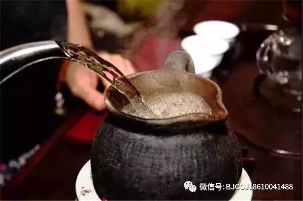 等待砂罐煨熱后,放入茶葉,迅速抖動簸蕩偎烤。待茶葉烤至微黃色,飄逸出清幽的茶香時,便沖入一勺開水。