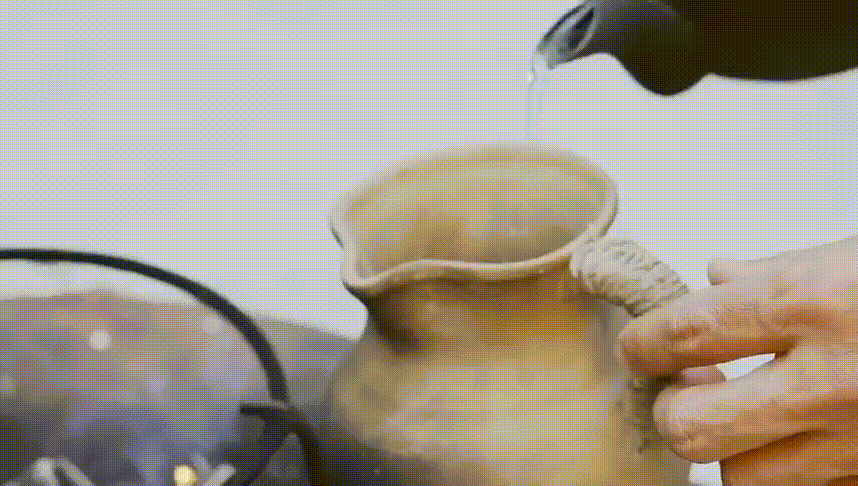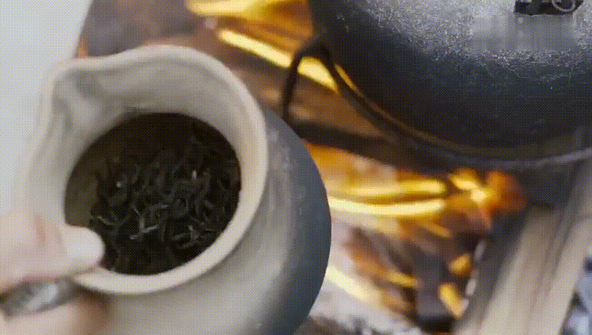 烤茶烤的是干茶,用的是特制的陶罐,等待砂罐煨熱后,放入茶葉,迅速抖動(dòng)簸蕩偎烤??静柽^(guò)程中注意火候,不斷顛茶,防止烤糊。