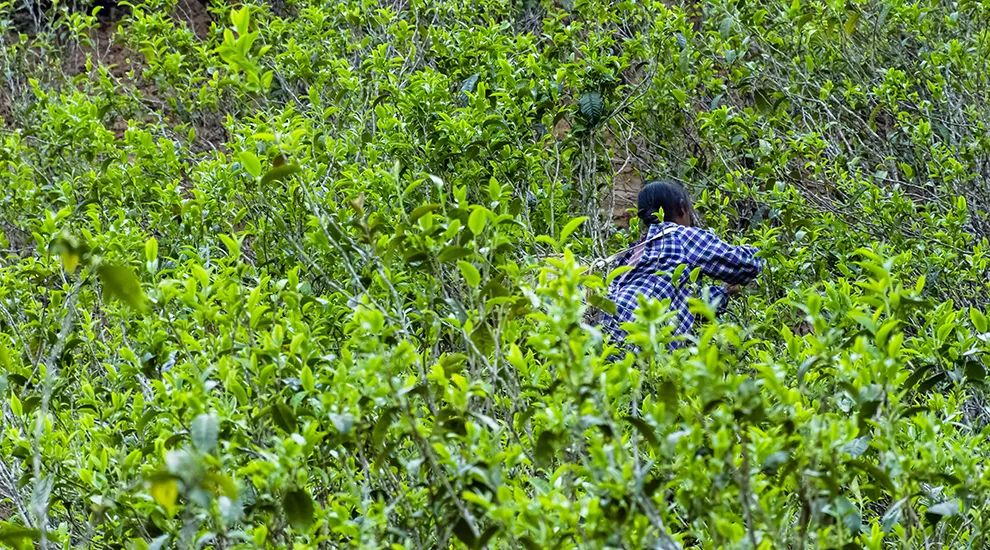 整片山坡上都生長著茶樹,但山坡頂端仍得算是森林的范圍。站在下方向上望去,森林外圍的幾棵樹身后便是黑洞洞的深綠色,盯得久了,甚至疑心是否會有什么動物從樹林間竄出來。