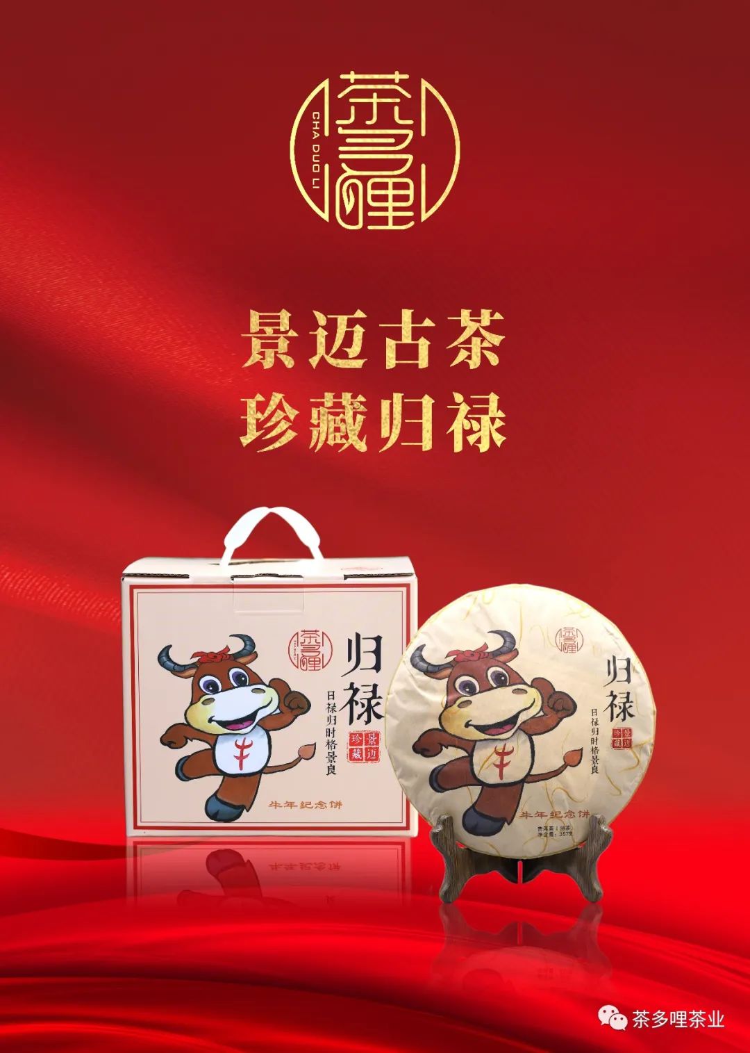 茶多哩牛年紀(jì)念餅,采自景邁古茶山千年福澤的古樹嫩葉為原料,傳統(tǒng)工藝精細(xì)制作,取流淌于景邁茶山清盈潔凈的天潤雨露,足額發(fā)酵55天,陳化三年,石磨人工壓制成餅,名為“歸祿”。