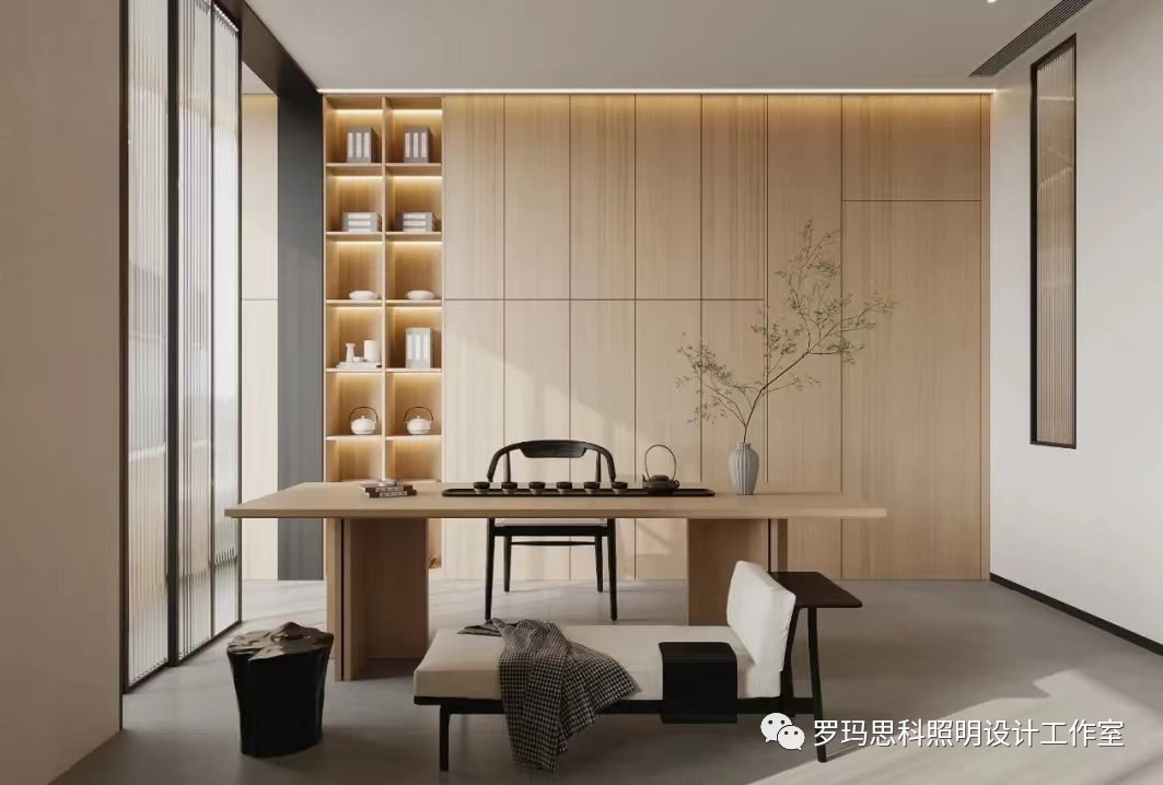房間的基礎(chǔ)照明有兩種方案:一是安裝防眩筒燈,讓整個(gè)頂部周圍呈現(xiàn)均勻亮度;第二,可以安裝簡(jiǎn)潔的吸頂燈滿足茶室空間的基礎(chǔ)照明。