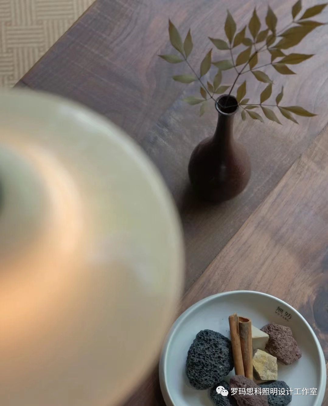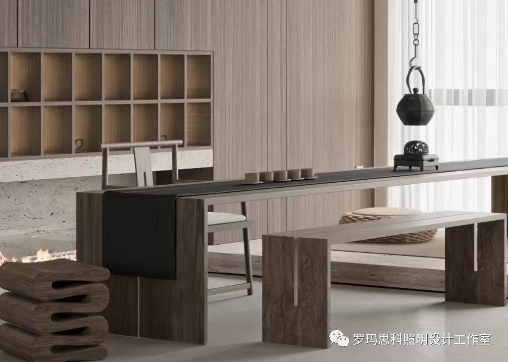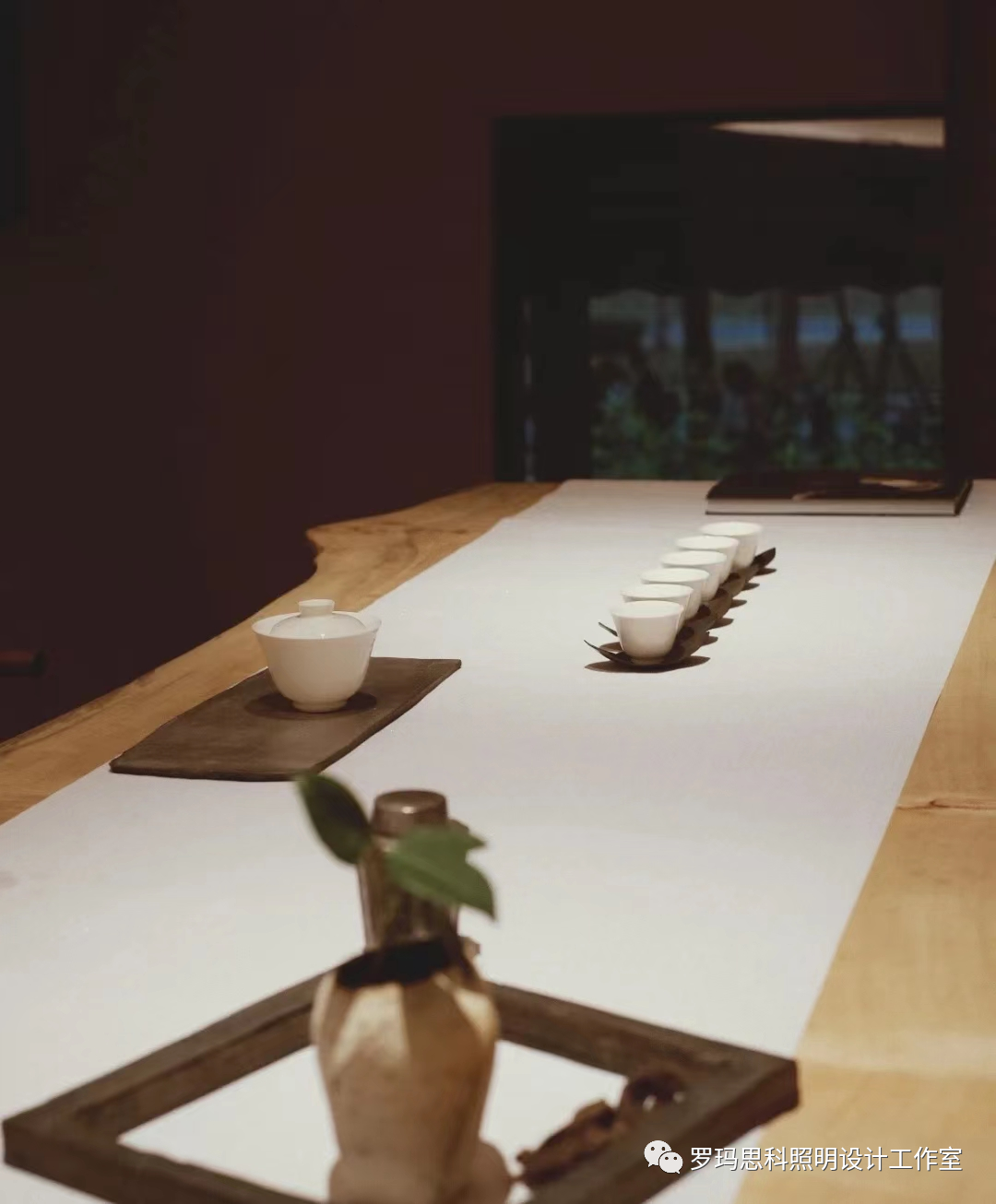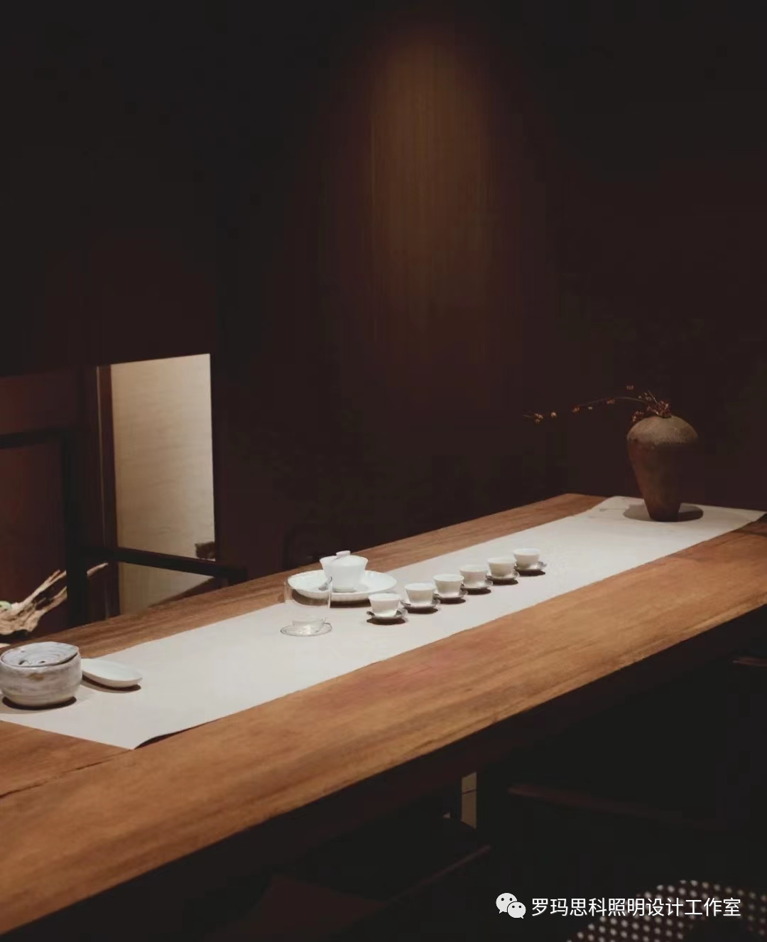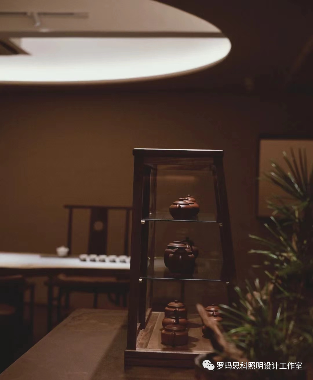 茶臺(tái)上方利用藝術(shù)吊燈給予桌面照度,同時(shí),搭配小角度射燈,可對(duì)茶具和茶臺(tái)擺件進(jìn)行重點(diǎn)照明的同時(shí),還可切換用光模式。