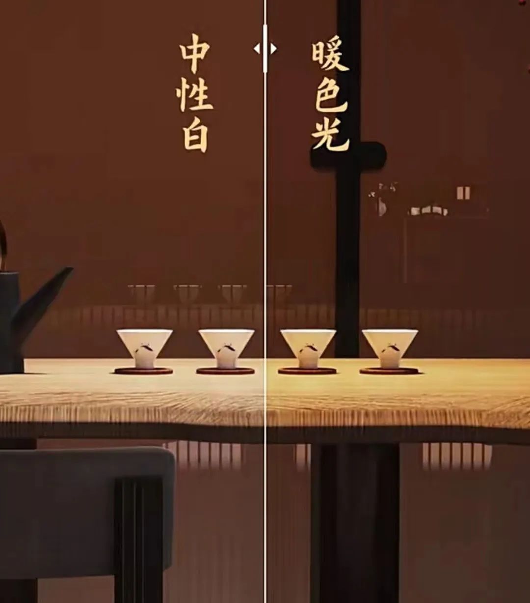 1.茶室需要溫馨舒適的環(huán)境,寧?kù)o的氛圍與自然融合,享受減緩流逝的時(shí)光,色溫應(yīng)選擇暖色光,色溫建議3000K為宜。