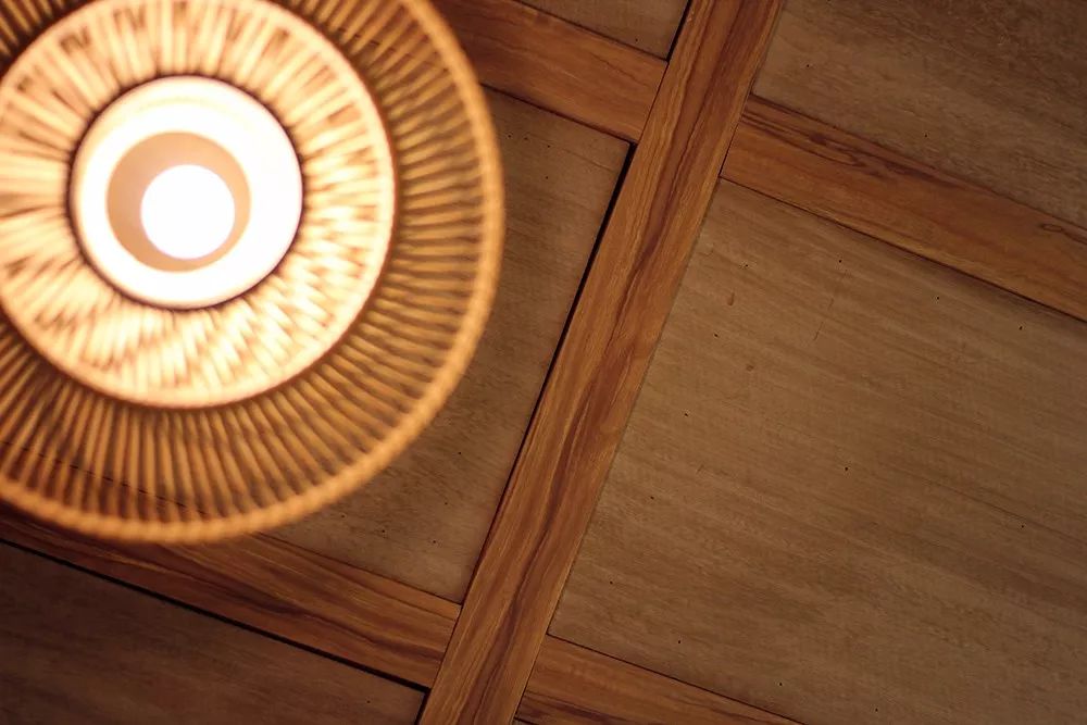 茶室的頂上可采用木方格平頂,并且設(shè)計高低區(qū)塊,或在頂部下垂部分花格,營造氛隔,使人心情舒適、輕松愜意。
