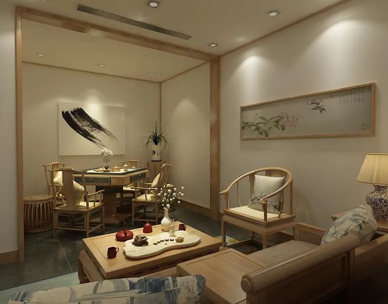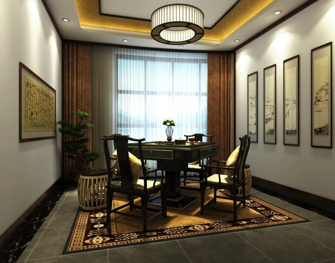 茶室的功能也不單單限于喝茶,更為重要的是要能夠修身養(yǎng)性,為自己提供一個(gè)修身養(yǎng)性的去處,因此也可以是茶室與書房合二為一,喝茶品味人生百味的同時(shí)提筆揮毫潑墨,也是一大快事,或者加入一副棋盤,與友人對(duì)弈一局,從千變?nèi)f化的棋局中來領(lǐng)悟人生也并有一番情趣。