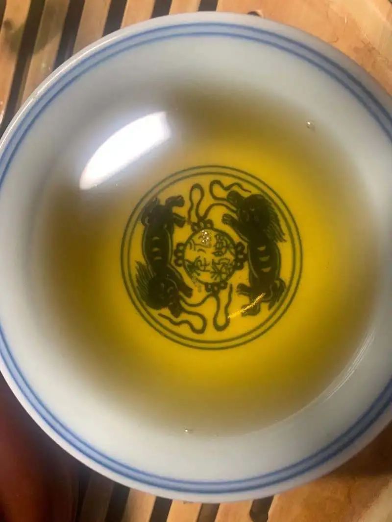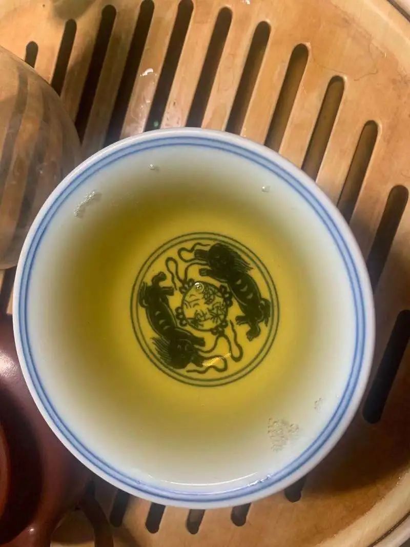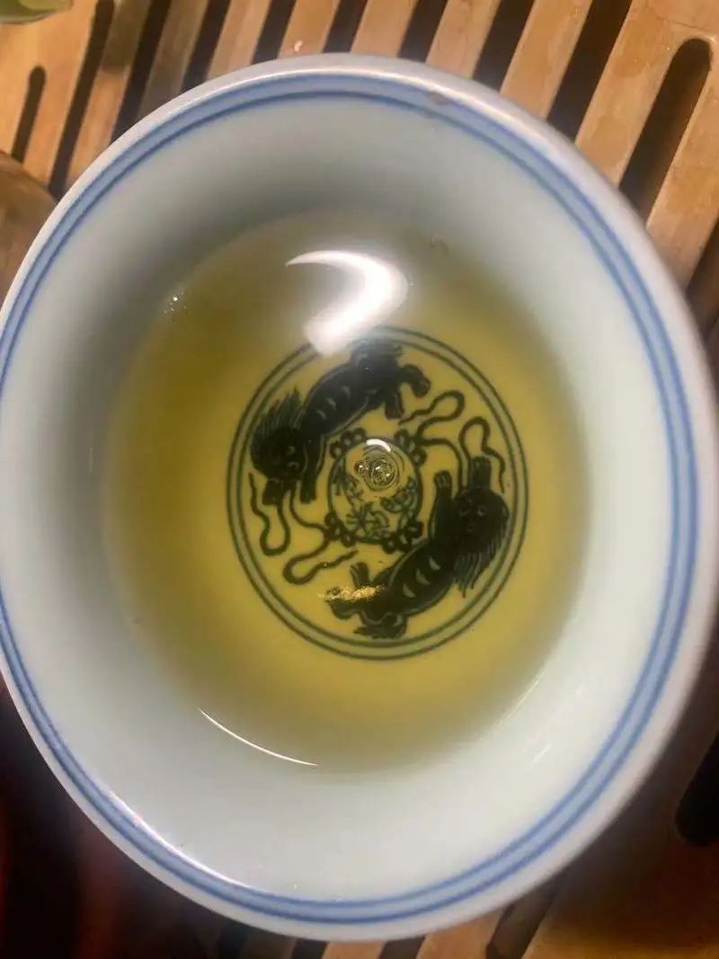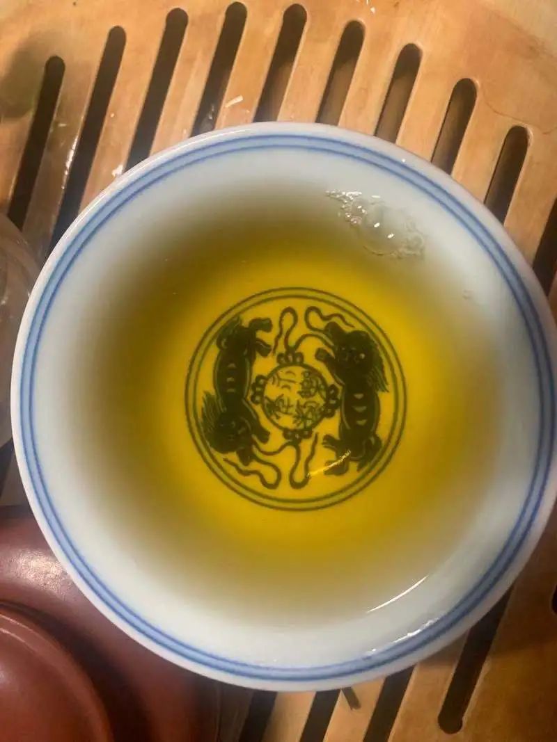 第一泡茶湯呈淡黃色,入口有微微苦澀感,入口后約30s化開;茶湯入喉后有些許回甘和生津之感。
