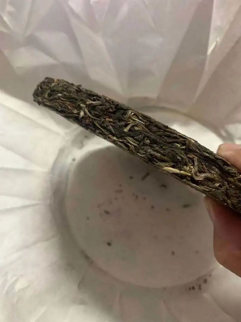 打開棉紙包裝看茶餅兩邊茶條相對比較肥碩,有部分芽頭,整體色澤趨于統(tǒng)一,可以大致判定應(yīng)該是純料茶。
