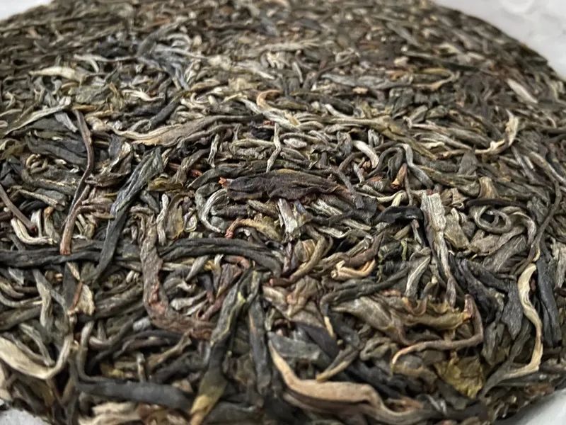 打開包裝內(nèi)部,餅面正圓油亮,條索粗壯有勁,芽頭白毫明顯。這款茶的壓制正面圓形,上下直角,有點(diǎn)像鐵餅的壓制形狀,但是翹茶的時(shí)候非常輕松,不屬于緊壓茶,很輕松就能翹出一塊條索完整的茶塊。這點(diǎn)跟20年大忠山一樣。
