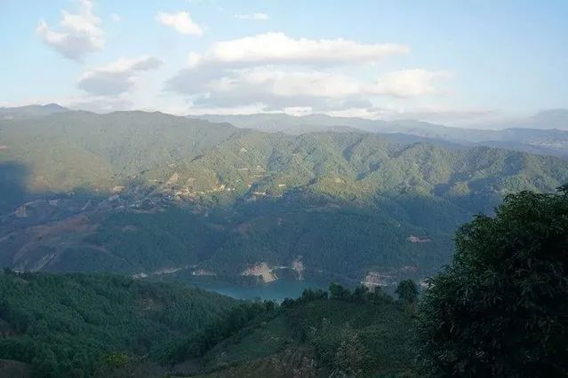 我們一行人沿鎮(zhèn)中一路向北,兩岸青山環(huán)繞,東西半山鼎足而立。茶山之上,云霞明滅,山間古寨,錯落有致。