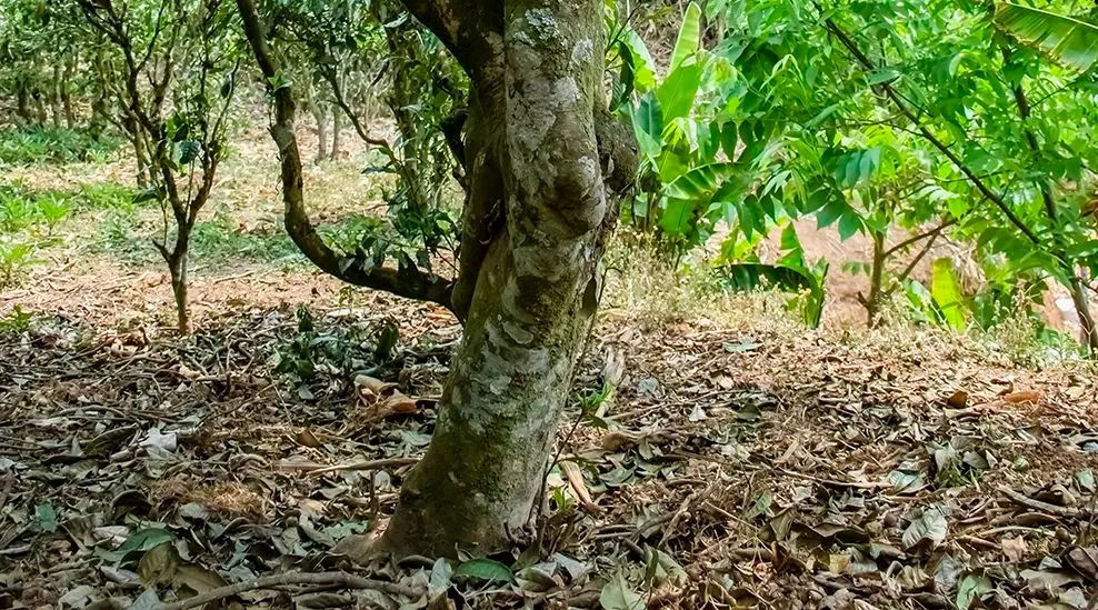 在茶地或茶園中,判斷茶樹樹齡最直觀的方法就是看這棵樹長得大不大。因為茶樹生長緩慢,生長周期長,用當地人的說法叫“耐長”,因此如果一棵樹長得粗壯挺拔,枝繁葉茂,這棵樹十有八九就是一棵大古樹。而在懂過的茶地中,隨便挑選一棵茶樹,其樹干直徑幾乎都與我小臂長度相當,還有相當一部分茶樹的直徑要更寬。